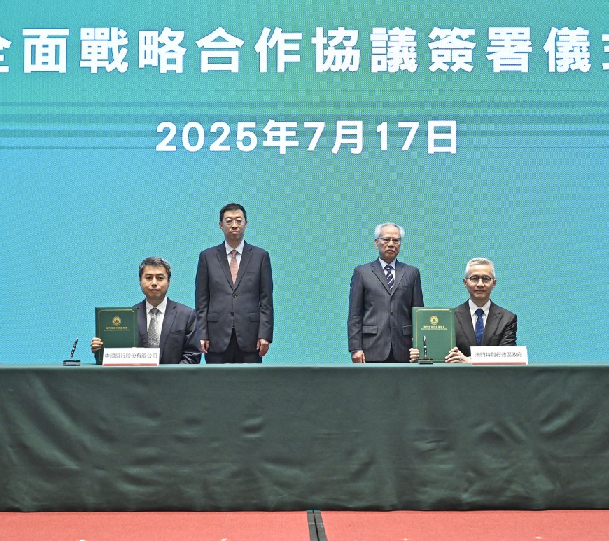 日前於橫琴粵澳深度合作區,在行政長官岑浩輝及中國銀行董事長葛海蛟的見證下,經濟財政司司長戴建業及中國銀行總行副行長武劍分別代表澳門特別行政區政府和中國銀行股份有限公司簽署了《中國銀行服務澳門特別行政區政府全面戰略合作協議》。