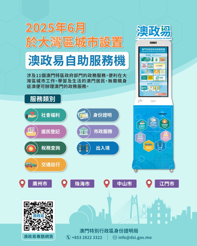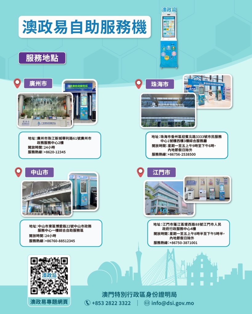 有關「澳政易」自助服務機詳情,請瀏覽「澳政易」專題網頁:https://www.dsi.gov.mo/mo-eservice/。有關「跨境通辦」專區,請瀏覽廣東政務服務網「跨境通辦」網頁:https://apps.gdzwfw.gov.cn/kytb-hk/#/。