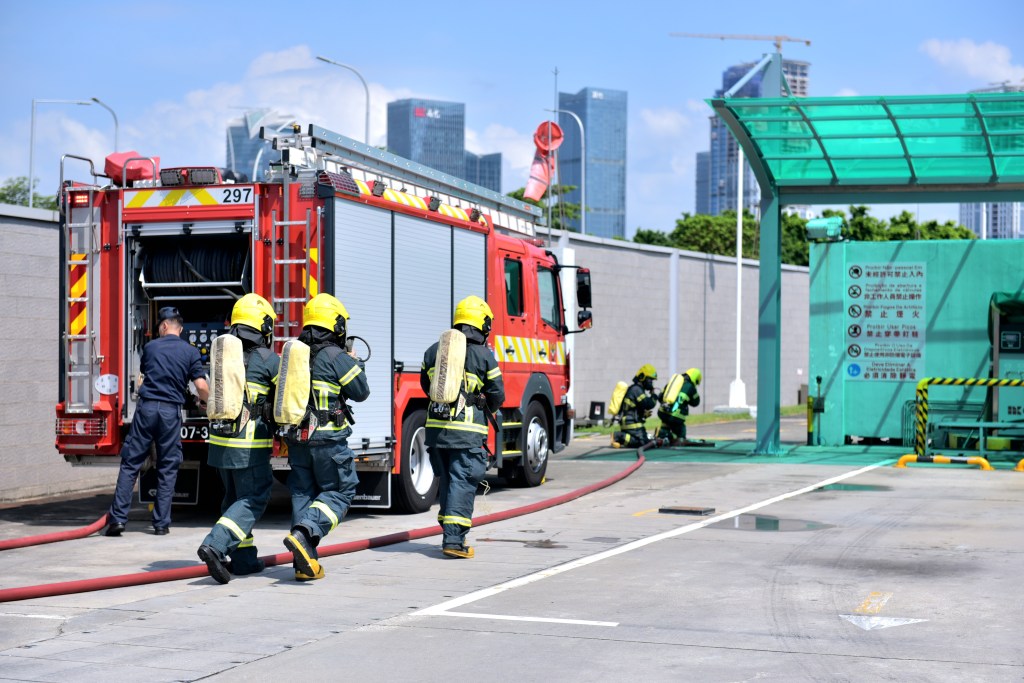 消防局接報後,隨即派遣7輛緊急車輛及27名隊員趕赴現場,並按照既定行動預案開展處理洩漏及疏散救援行動工作。消防人員於現場探測到有天然氣洩漏,並射水進行保護,進入洩漏位置關閉肇事天然氣管道的總掣。同時,救護員在疏散集合點清點人數,並對一名員工在疏散途中受傷的員工進行護理後模擬送院治理。