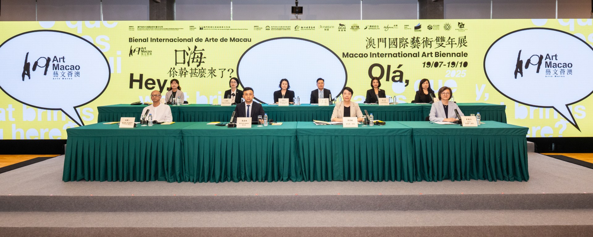 新聞發佈會於7月2日在澳門文化中心會議室舉行,文化局局長梁惠敏,教育及青年發展局副局長黃嘉祺,旅遊局旅遊推廣廳廳長劉鳳池,新濠博亞娛樂董事鍾玉文,澳娛綜合度假股份有限公司企業品牌發展及市場推廣高級副總裁梁珮兒,銀河娛樂集團公共關係助理高級副總裁黃芝蓉,威尼斯人澳門股份有限公司企業傳訊及社會事務副總裁江慧賢,永利澳門及永利皇宮項目策劃副總裁劉健敏,美高梅文化藝術總監何桂姍,「藝文薈澳:澳門國際藝術雙年展2025」總策展人馮博一,文化局副局長鄭繼明及蔡健龍,視覺藝術發展處處長尹保倫,澳門藝術博物館代館長唐重,「藝文薈澳:澳門國際藝術雙年展2025」聯合策展人劉鋼及吳蔚,以及參展本地藝術家陳顯耀、陳頴藍、周凱倫、何俊彥、吳敏慧、吳少英、司徒儉、黃美婷及黃穎祥等出席。