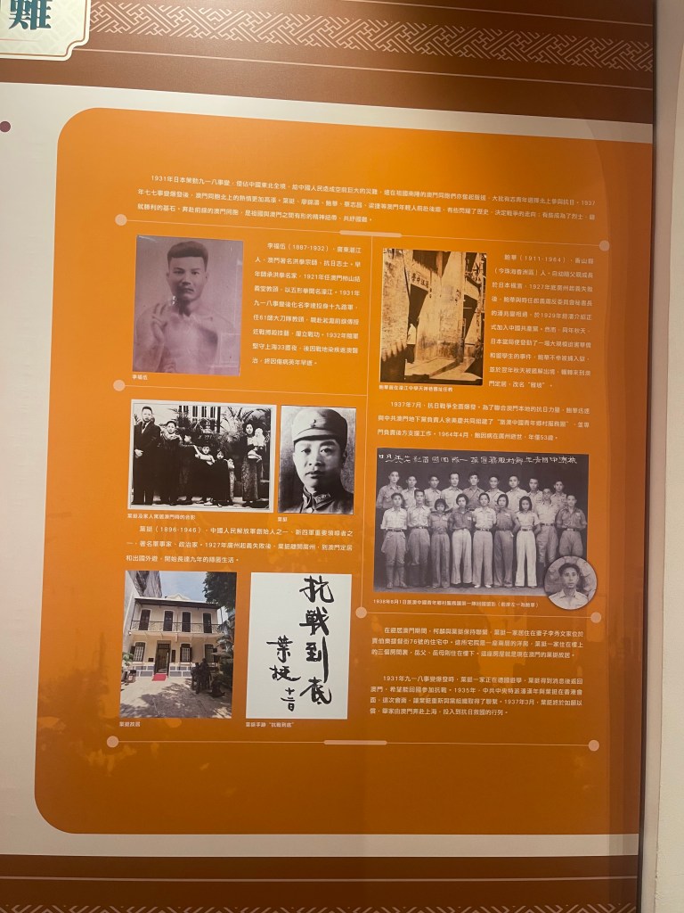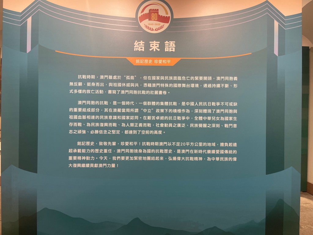 抗戰硝煙雖已遠去,忠魂英烈的精神卻如炬長燃。今天的澳門,是一座和平繁榮的現代都市,但不應忘記,曾有一代又一代澳門人,在民族危亡時刻,以熱血與行動守護家國、撐起民族尊嚴。這一場群像展覽,不僅是對先烈的追憶,更是對未來的啟迪——讓歷史成為我們共同的精神根基,讓抗戰精神在時代長河中熠熠生輝。