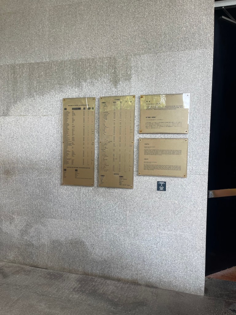 走進大三巴牌坊後方,順階梯而下,首先映入眼簾的便是莊嚴肅穆的墓室空間。墓室中央為一座花崗岩墓穴遺址,根據考證,墓主很可能正是聖保祿學院創始人、意大利傳教士范禮安神父,他於1606年在澳門去世,當時聖保祿教堂尚在興建之中。墓穴兩側的納骨龕,則安放著來自日本及越南的天主教殉道者骸骨,部分更是由路環聖方濟各聖堂遷移至此。