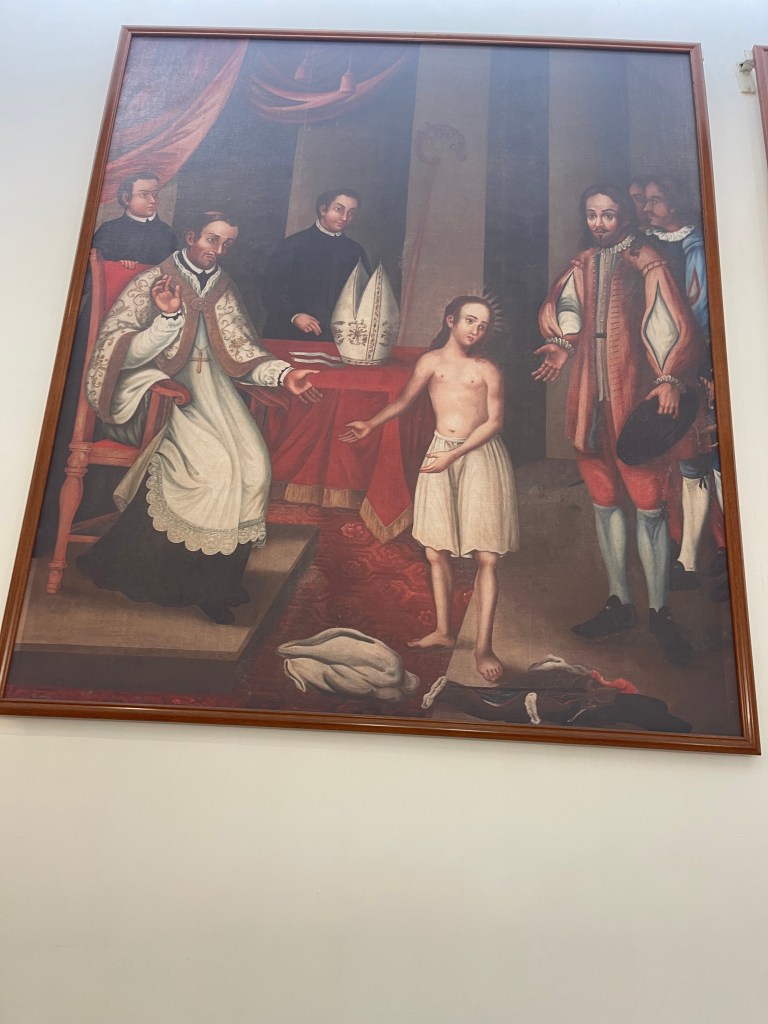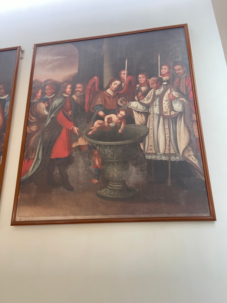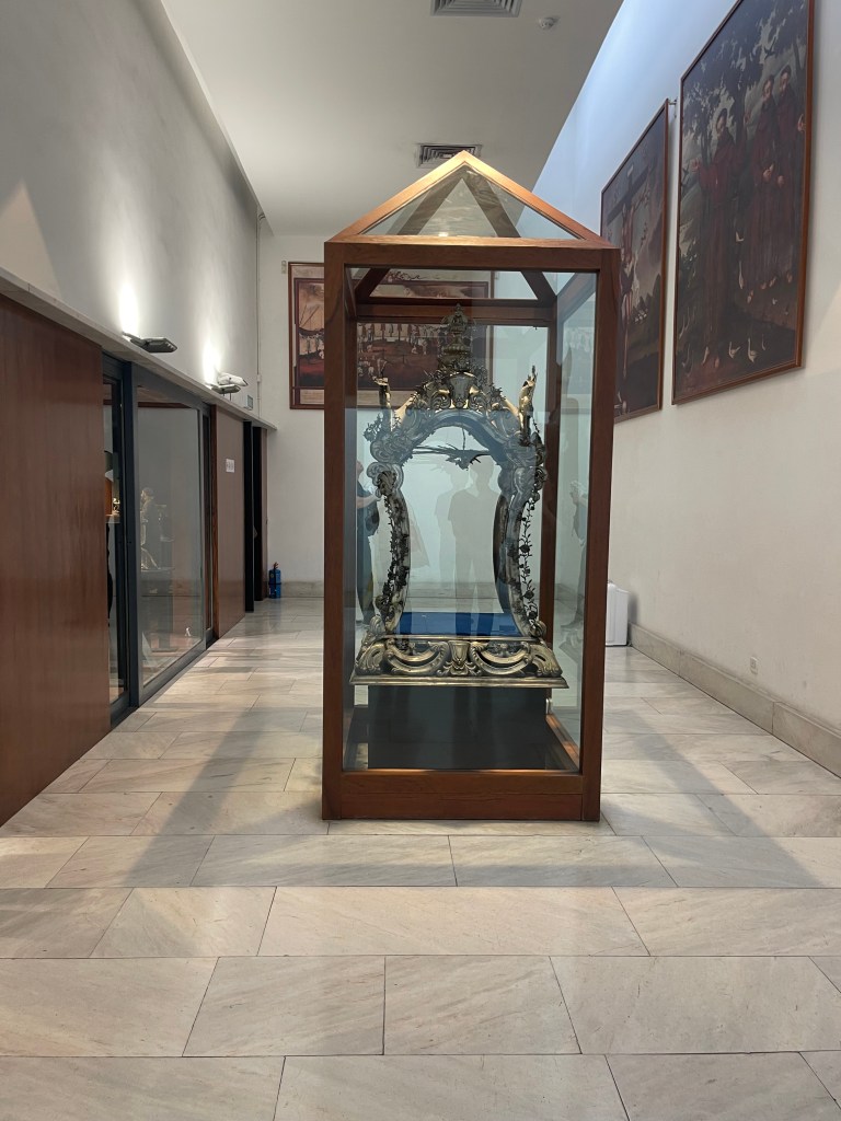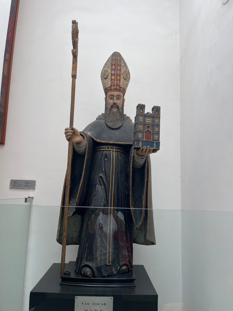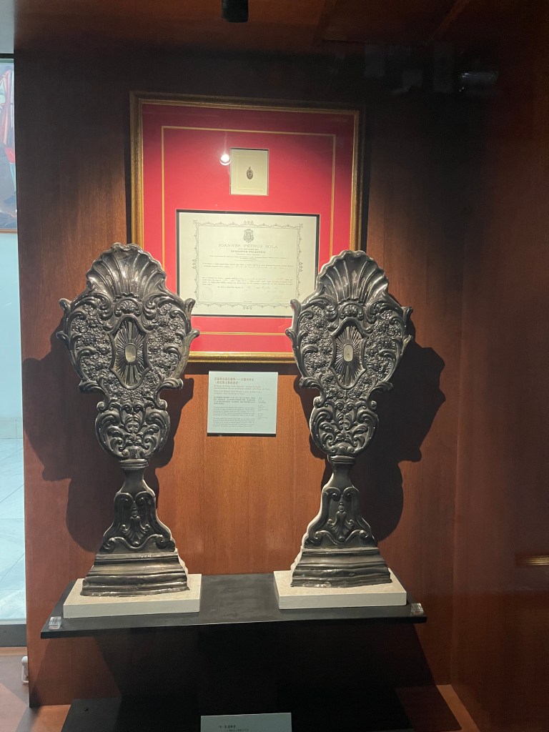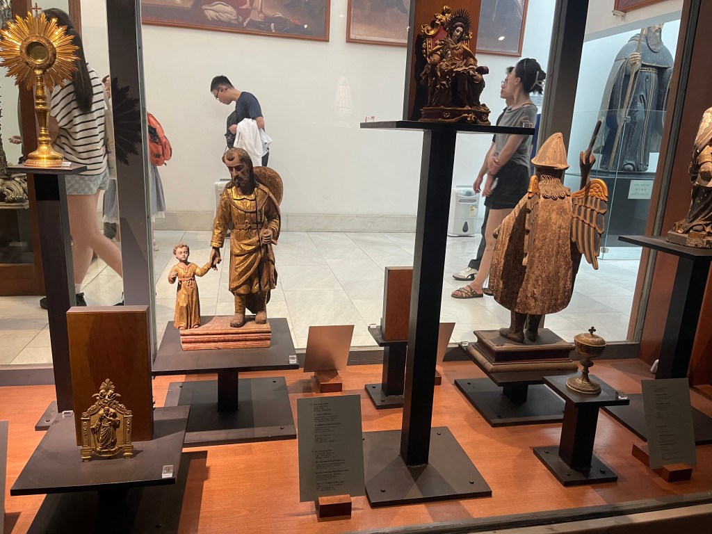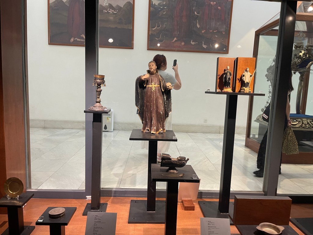 穿過墓室,一門之隔便是天主教藝術博物館展廳。雖然展廳面積不大,但展品極具代表性和歷史價值,堪稱澳門天主教藝術的精粹所在。館藏共三十四件展品,皆由本地多間教堂及修院精選捐贈,包括16至19世紀的油畫、雕塑、聖體器皿、聖像、禮儀飾物、宗教書籍等。