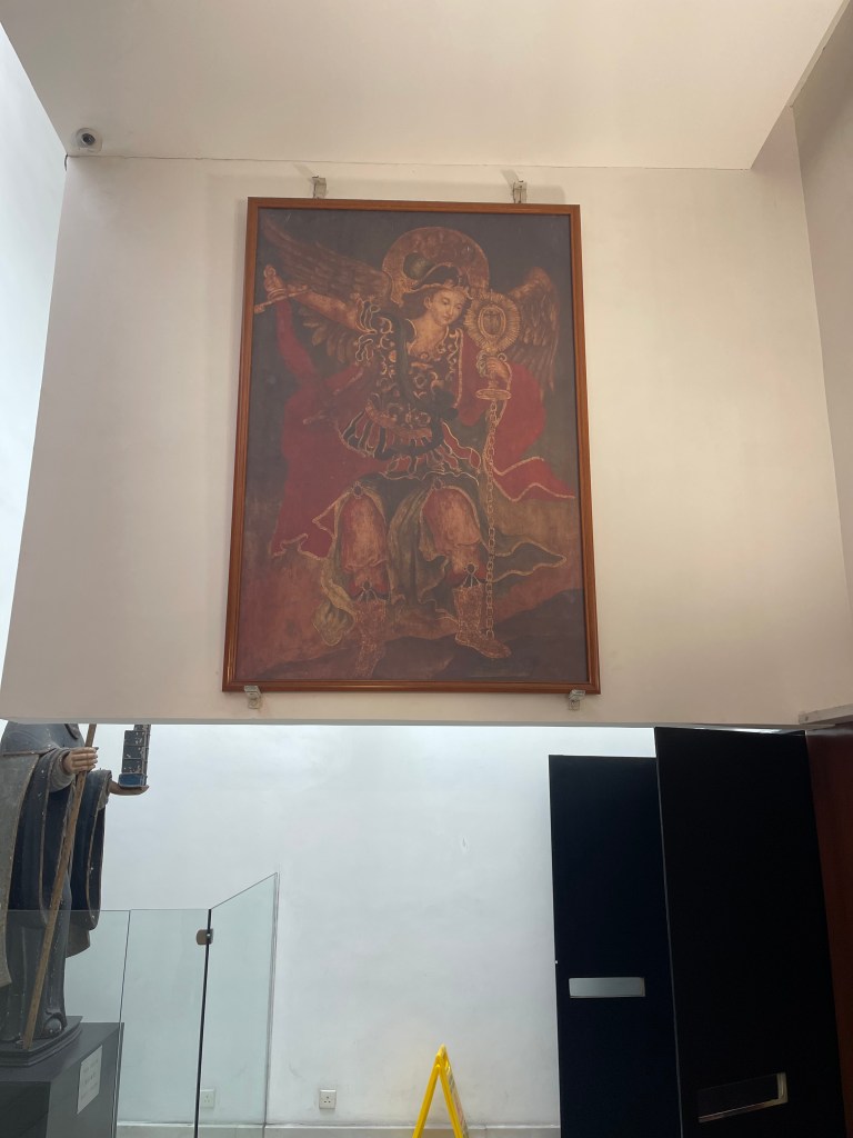 展品以玻璃展櫃分隔,參觀動線明確,令每一件展品都能被細細欣賞。其中最矚目的是《聖彌額爾大天神》油畫,此畫不僅是1835年聖保祿大教堂大火後唯一倖存的學院油畫,更承載了教堂與學院數百年歷史的印記。畫作描繪聖彌額爾大天神驅逐邪惡的場景,畫風莊嚴神聖,成為澳門宗教藝術的重要標誌。