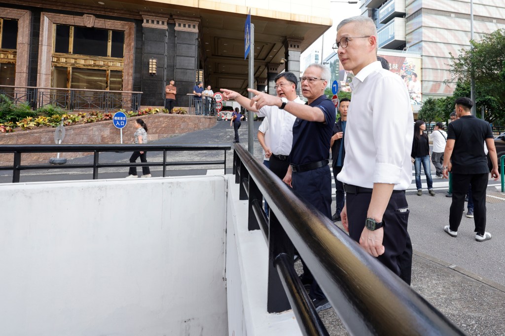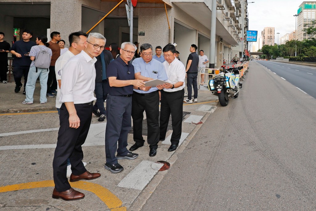 其後,岑浩輝步行至靠近市集的友誼大馬路一側視察,聽取運輸工務司司長譚偉文介紹優化新口岸周邊道路設施的構思,包括便利行人橫過友誼大馬路的完善措施。一行隨後經附近的公共停車場前往皇朝區,沿途視察了解新口岸區周邊的停車條件,以及徒步通行新口岸和皇朝區之間的現況。