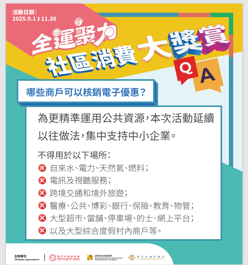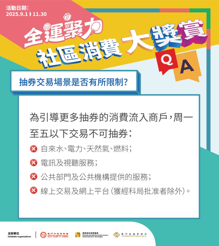 是次活動消費優惠的適用範圍,除抽取優惠的交易場景限制,亦不包括跨境交通服務、境外旅遊服務、醫療服務、博彩活動場所、銀行及保險公司及其他金融機構、當押店、大型連鎖超市、物業管理公司、教育機構、停車場、的士、咪錶、自助售賣機以及大型綜合旅遊休閒企業設施內的商戶,以精準扶持民生區,引流市民到社區消費。