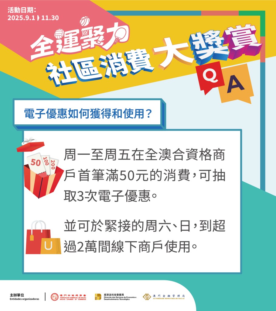 活動期間每逢周六、日,消費者透過承辦單位電子錢包在全澳可核銷電子優惠的商戶單筆實付50元,可自動參加每周抽獎,每周將抽出三位幸運兒各得8,000澳門元現金獎。