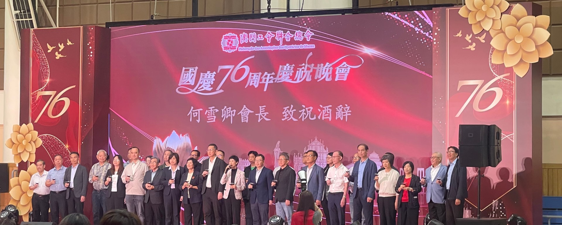 澳門工會聯合總會日前於工人體育館舉行慶祝中華人民共和國成立七十六周年晚會,中聯辦副秘書長兼社工部長黃華蓋、工聯總會會長何雪卿、全國政協澳區委員梁少培、中聯辦社工部副部長趙河清、漁民互助會會長冼金松、菜農合群社會長戴燕芳、市販互助會會長柯清煌、澳門志願者總會會長白琪文,工聯總會會務顧問梁玉華、理事長李從正、監事長阮愛武。