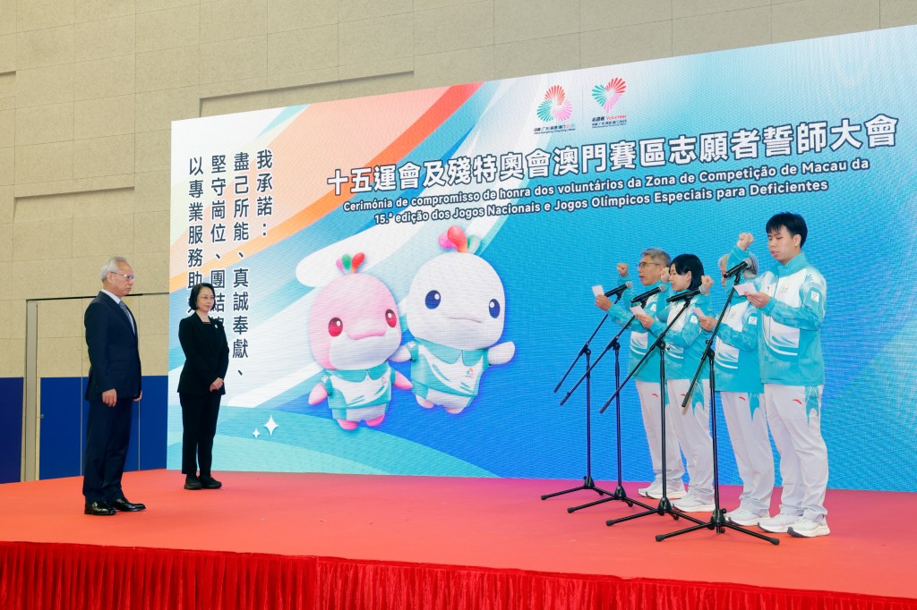 行政長官岑浩輝日前出席十五運會及殘特奧會澳門特區體育代表團授旗儀式暨澳門賽區志願者誓師大會。他致辭時表示,大家必將攜手同心,確保澳門賽區各項工作取得圓滿成功,致力實現賽事成績和精神文明的雙豐收,向海內外展示澳門打造「體育之城」的決心魄力、綜合實力和城市魅力。