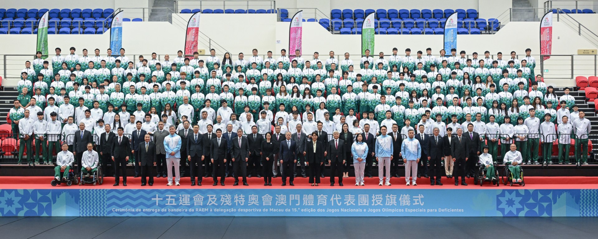 授旗儀式暨誓師大會在望廈體育中心舉行。岑浩輝向參與十五運會及殘特奧會的澳門體育代表團授旗,以及為澳門賽區志願者監誓。