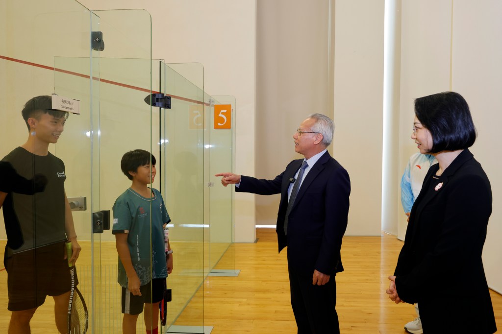授旗儀式暨誓師大會結束後,岑浩輝在社會文化司司長柯嵐陪同下,視察望廈體育中心的多項運動設施,了解相關設施日常的使用情況,並與市民親切交流。