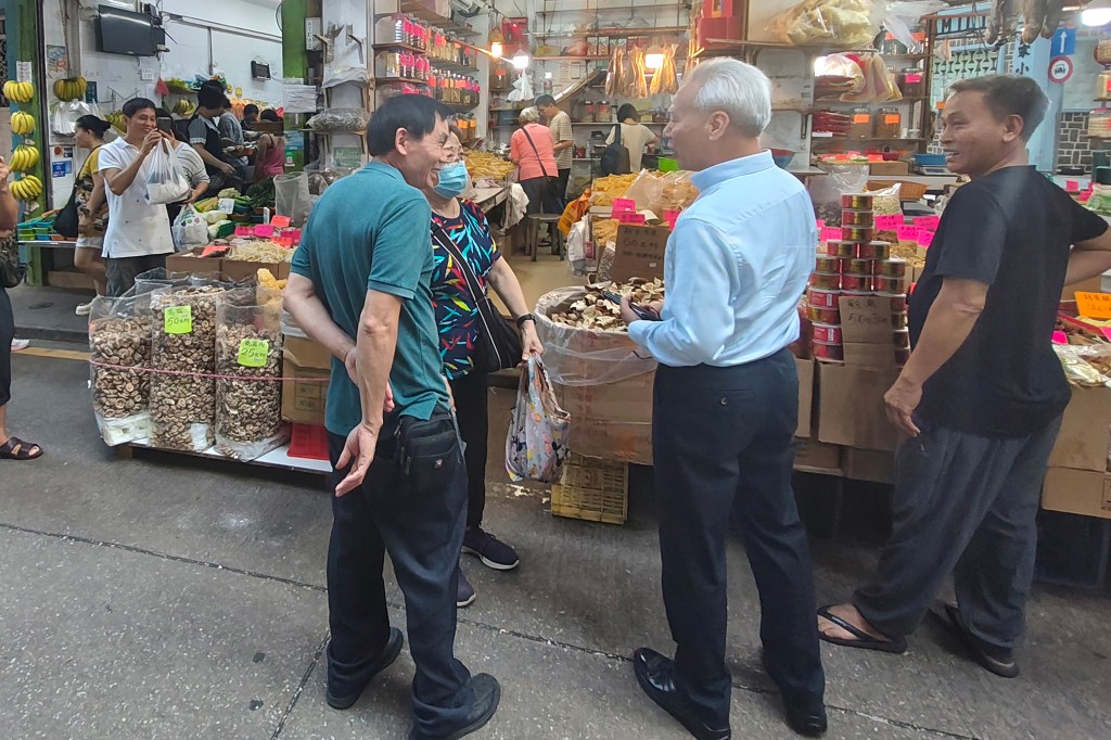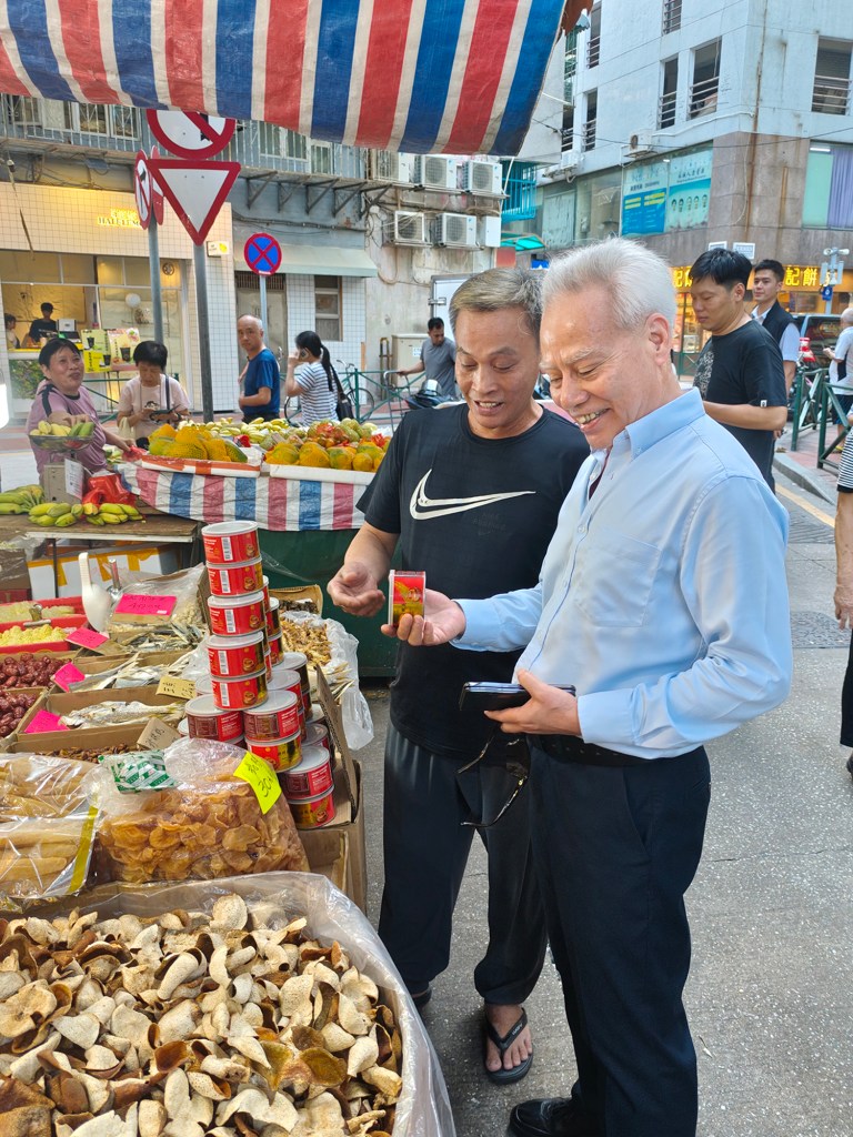 在政府總部與眾同樂後,岑浩輝還自個走訪義字街一帶買菜,與商戶和市民交談,了解中小企經營狀況,體察民情。