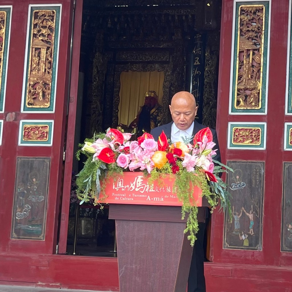 陳明金致辭表示,媽祖文化,傳承千年美德,「立德、行善、大愛」的精神廣受世人敬仰。二零零九年,「媽祖信俗」被聯合國教科文組織列入《人類非物質文化遺產代表作名錄》,成為國家首個信俗類世界遺產,標誌著媽祖文化已超越地域國界,成為全人類共同守護的文化瑰寶。澳門是世界上唯一以媽祖命名的城市,擁有深厚的媽祖文化積澱,媽祖信仰已深深融入澳門的社會肌理。因疫情原因,活動停辦五年,復辦媽祖文化旅遊節,並升格為國際性活動,更具特殊意義,特別要感謝特區政府和澳門中聯辦的重視和鼎力支持。今次邀請海內外逾千嘉賓共襄盛舉。在這個中西文化交匯的舞台上,以媽祖文化為紐帶,聯結海內外炎黃子孫,增強中華民族的凝聚力,讓中華文化在世界舞台上綻放光彩。