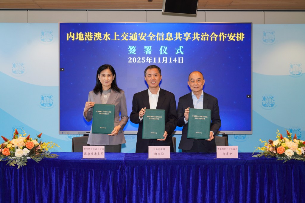 為共同保障大灣區海上交通安全,交通運輸部海事局、香港海事處及澳門海事及水務局於11月14日於澳門召開「內地—香港—澳門海事合作會議」及「港澳海上安全工作會議」,並舉行《內地港澳水上交通安全信息共享共治合作安排》簽署儀式,加強水上交通安全信息的互聯互通,共同提升海事治理效能,共同為大灣區構建更優質的海事安全體系。