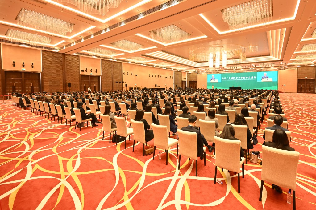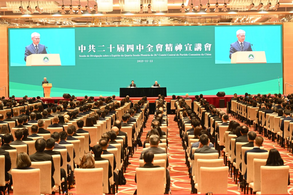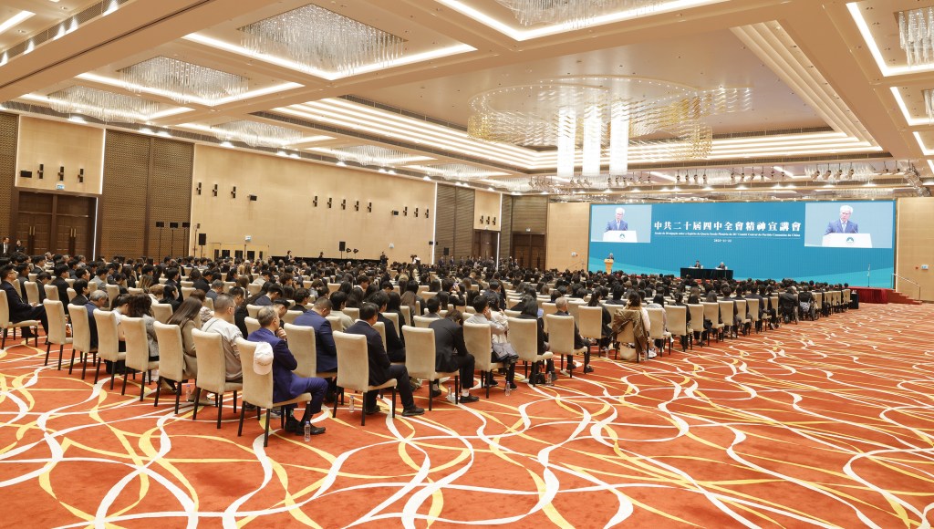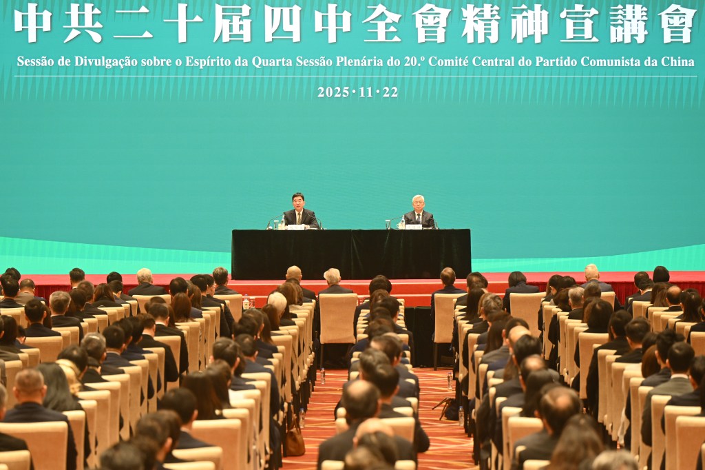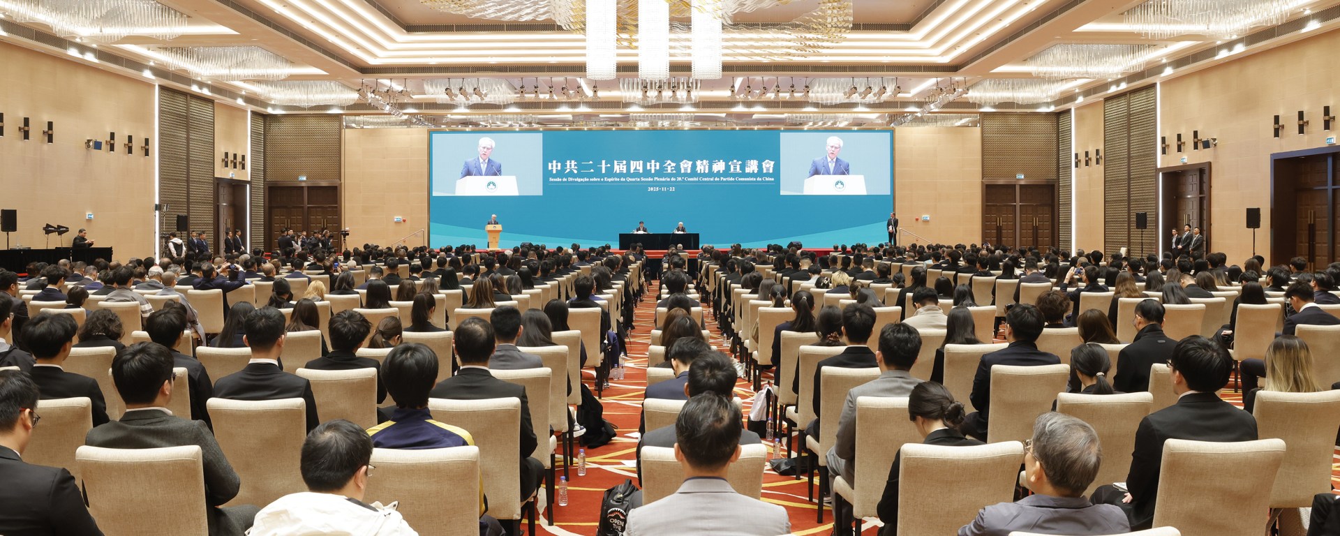 應澳門特區政府請求,經中央批准,中央港澳工作辦公室、國務院港澳事務辦公室邀請中央宣講團成員──中國科學院院長、黨組書記侯建國,以及中央財經委員會辦公室副主任、中央農村工作領導小組辦公室副主任祝衛東,於11月22日抵澳,向本澳管治團隊及社會各界全面宣講中共二十屆四中全會精神。兩場宣講會均在中國與葡語國家商貿合作服務平台綜合體舉行,合共吸引約1,200名澳門官員、社團人士及各界代表出席。