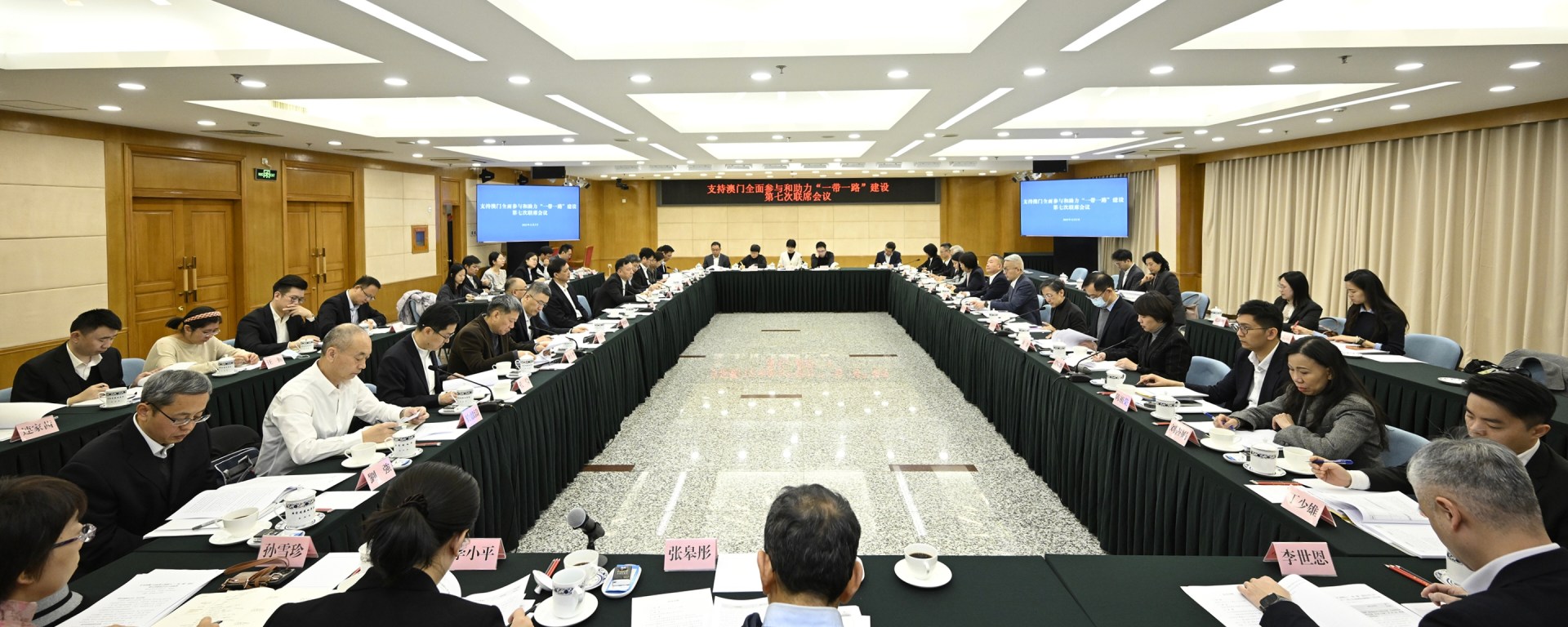 中央港澳辦、外交部、工業和信息化部、商務部、文化和旅遊部、中國人民銀行、海關總署、國務院國資委、金融監管總局、國家中醫藥局、國家藥監局、中央政府駐澳門聯絡辦公室,以及澳門特別行政區政府行政法務司、經濟財政司、社會文化司、運輸工務司、政策研究和區域發展局、經濟及科技發展局、旅遊局、招商投資促進局、澳門金融管理局、警察總局金融情報辦公室、治安警察局、教育及青年發展局、衛生局、藥物監督管理局等有關負責人參加了會議。