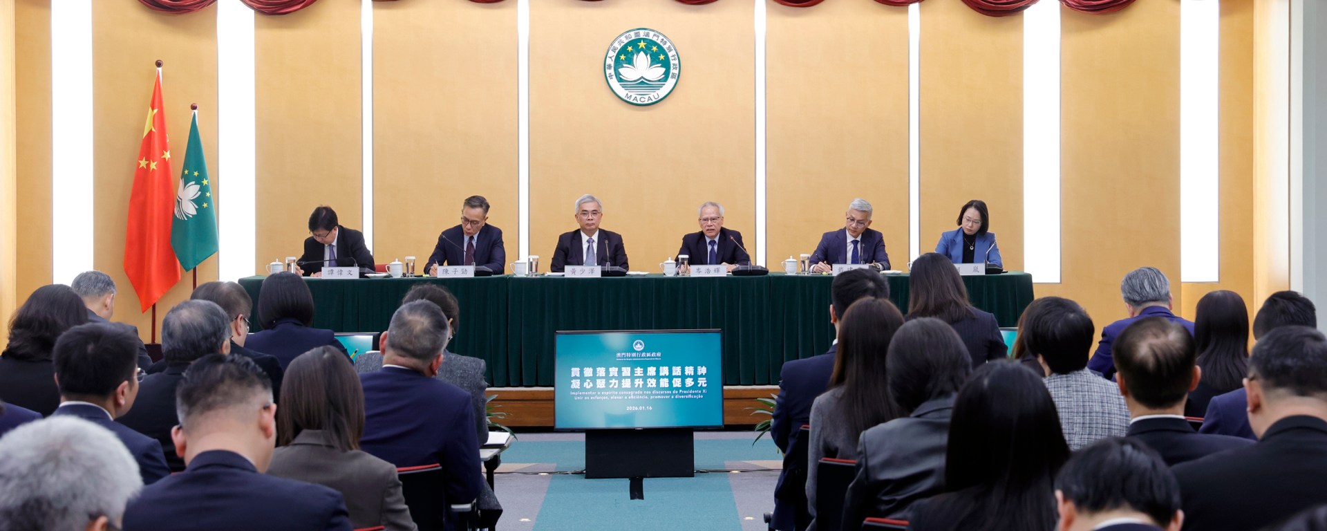 岑浩輝首先傳達去年12月赴京述職時,習主席和中央充分肯定特區政府過去一年的工作,並提及特區政府銳意進取、務實有為,堅定維護國家主權、安全、發展利益,順利舉行澳門第八屆立法會選舉,推動公共行政改革,積極參與粵港澳大灣區建設,各項事業有了新進步。習主席並叮囑特別行政區政府要主動對接國家「十五五」規劃,堅持和完善行政主導,紮實推動經濟適度多元發展,不斷提升治理效能,更好融入和服務國家發展大局。