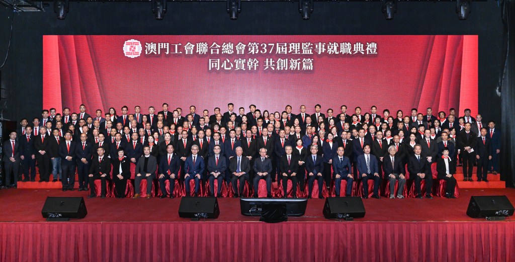 澳門工聯總會成立76周年聯歡晚會暨第三十七屆理監事就職禮日前在漁人碼頭會展中心宴會廳舉行,行政長官岑浩輝、全國政協副主席何厚鏵、中聯辦副主任張應杰等出席,外交部駐澳署理特派員程雷、立法會主席張永春、經濟財政司司長戴建業,以及本澳及內地、香港工會代表和社會各界人士到場祝賀。