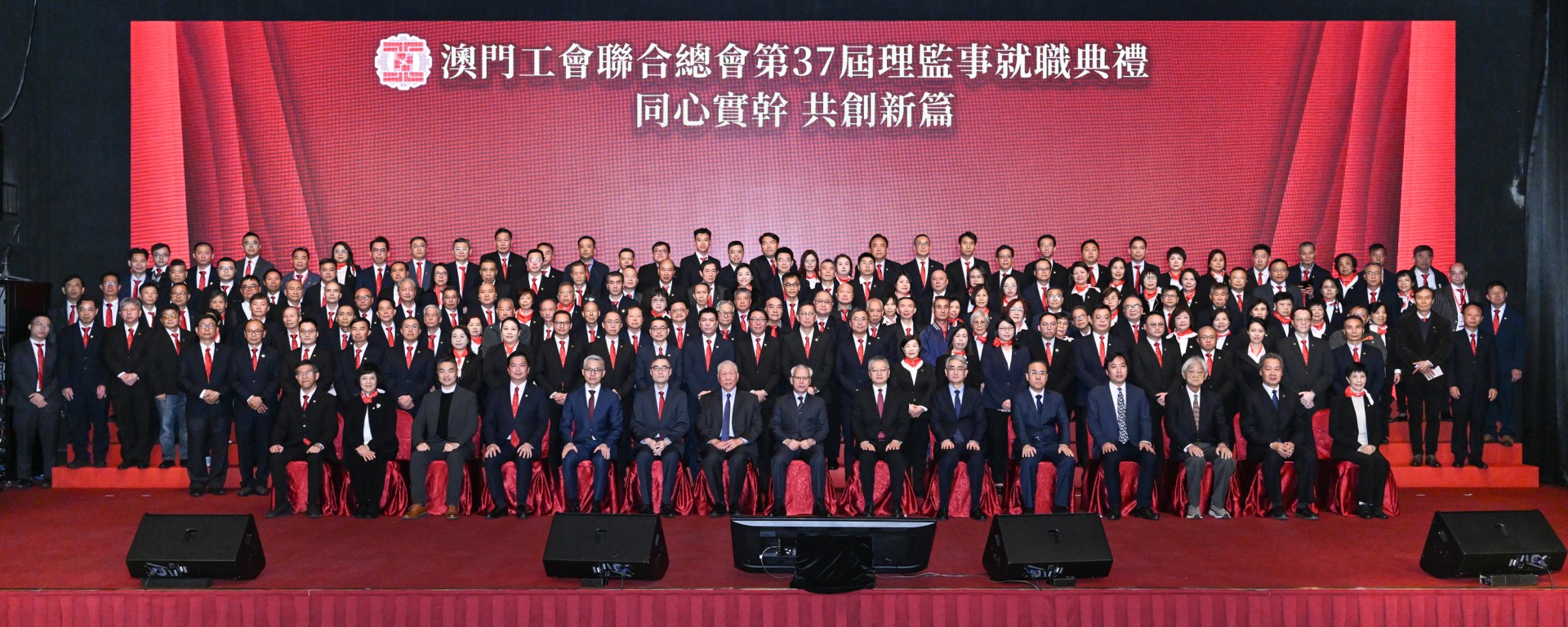 澳門工聯總會成立76周年聯歡晚會暨第三十七屆理監事就職禮日前在漁人碼頭會展中心宴會廳舉行,行政長官岑浩輝、全國政協副主席何厚鏵、中聯辦副主任張應杰等出席,外交部駐澳署理特派員程雷、立法會主席張永春、經濟財政司司長戴建業,以及本澳及內地、香港工會代表和社會各界人士到場祝賀。