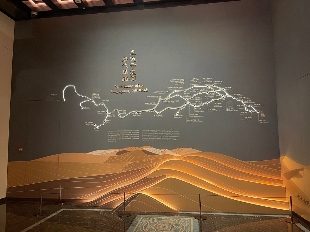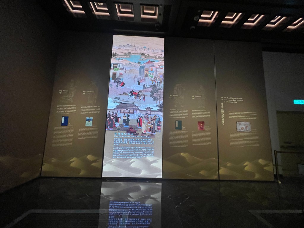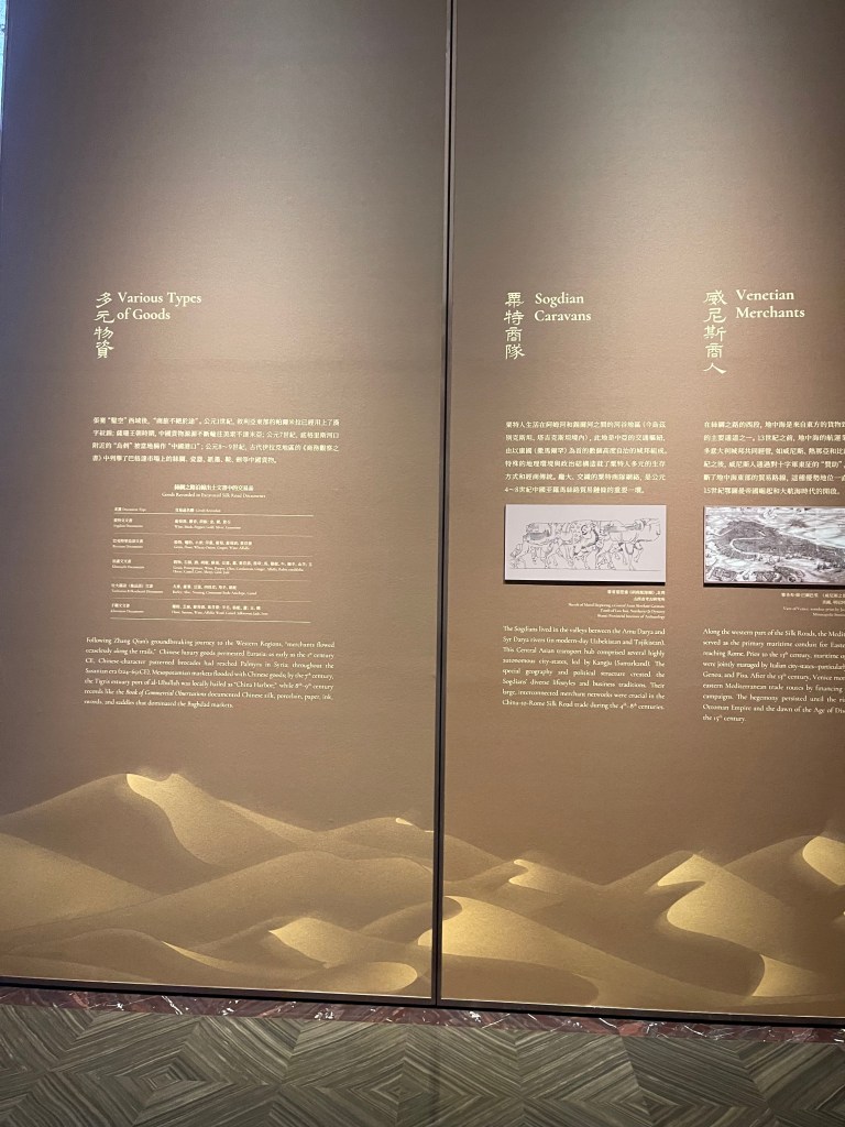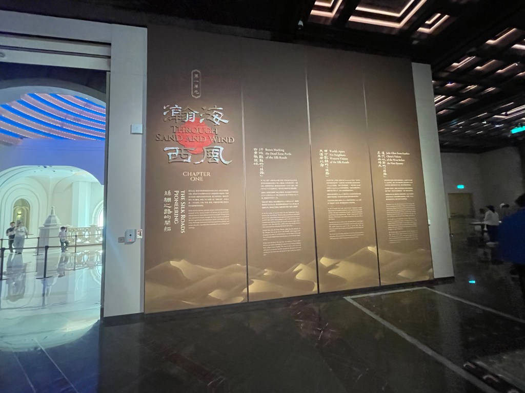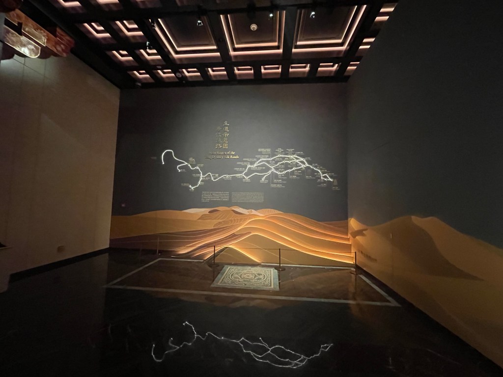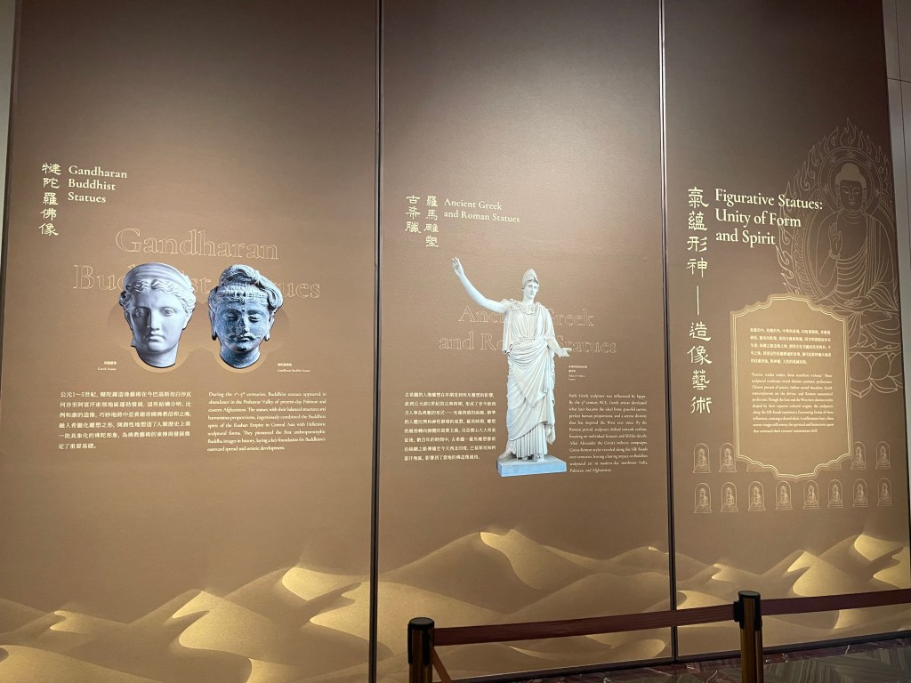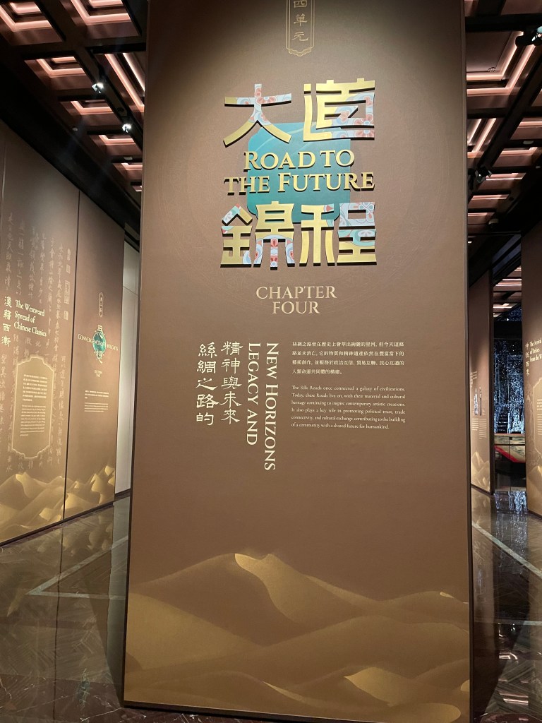 展覽以四大單元鋪陳脈絡︰「瀚海西風」、「星漢燦爛」、「和光同塵」、「大道錦程」。從開拓、到技術與生活、到精神與審美、再到古今互證的當代表達,形成一條從「鑿空」走向「未來」的敘事線。這種策展策略的關鍵,是不把絲路理解為某條固定路徑,而是把它視作一個長期運作的交流系統:貨物、工藝、宗教、法律制度、音樂與圖像語言,都在系統中流通、改寫與再生。在展廳裡看到不同時代、不同地域的作品彼此對話,像多語世界的同場翻譯,有時互相補全,有時互相挑戰,但幾乎總能讓觀眾意識到:文明的邊界從來不是牆,而是接縫。