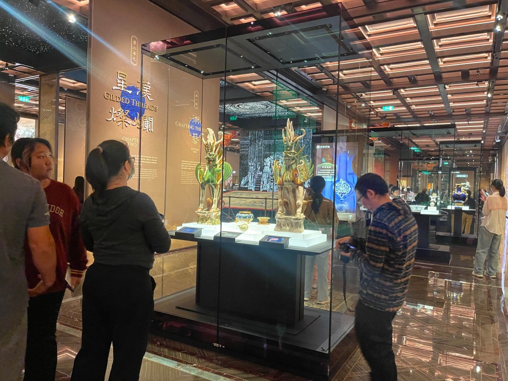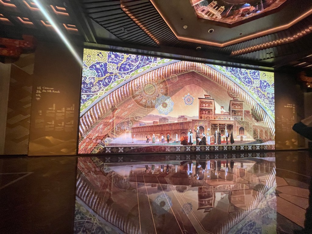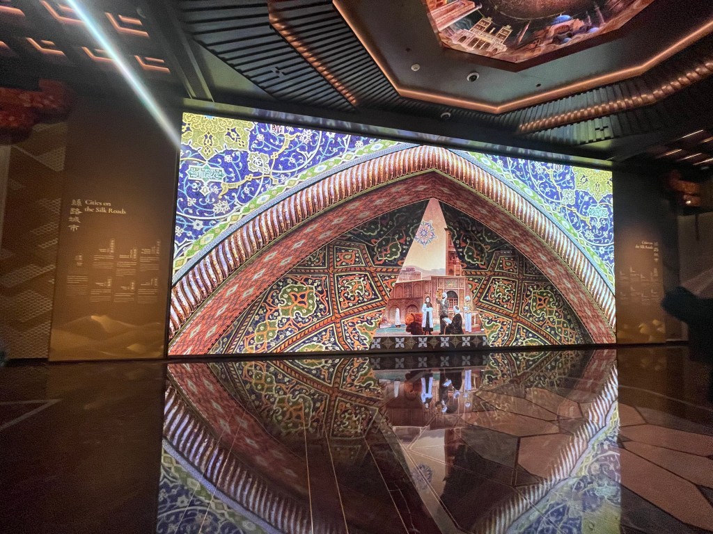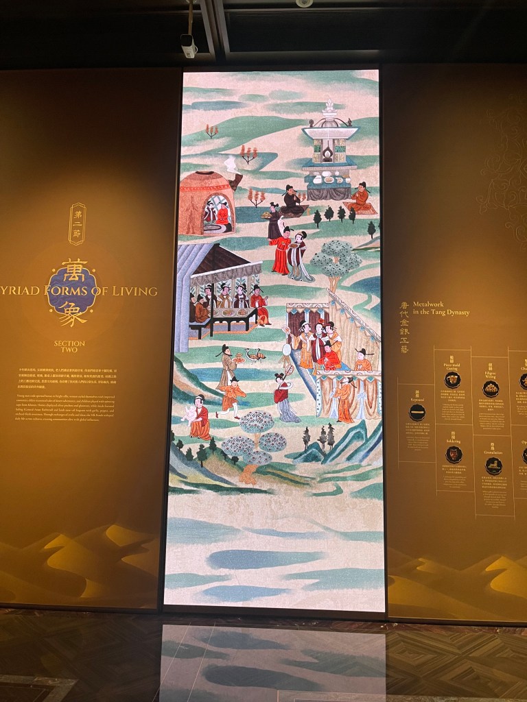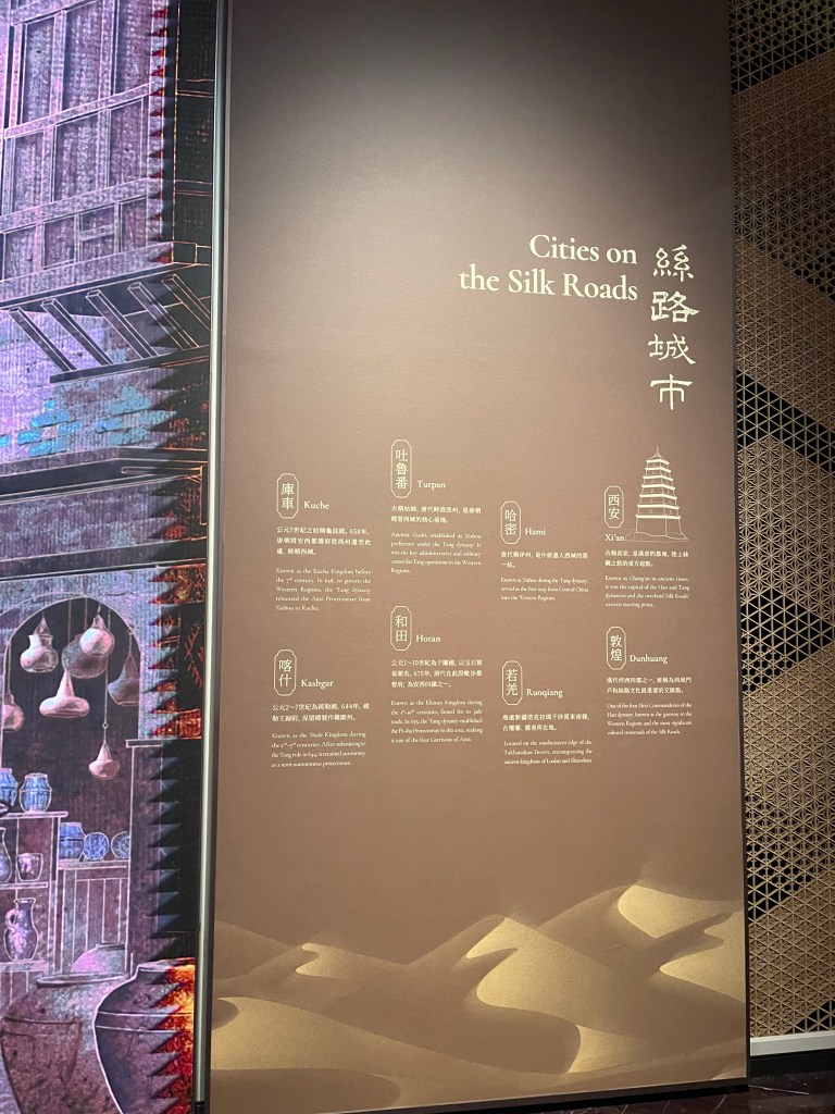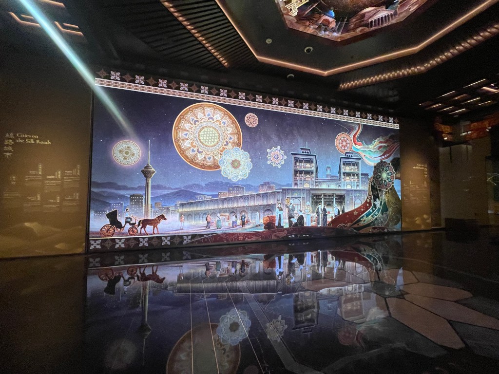 展覽以四大單元鋪陳脈絡︰「瀚海西風」、「星漢燦爛」、「和光同塵」、「大道錦程」。從開拓、到技術與生活、到精神與審美、再到古今互證的當代表達,形成一條從「鑿空」走向「未來」的敘事線。這種策展策略的關鍵,是不把絲路理解為某條固定路徑,而是把它視作一個長期運作的交流系統:貨物、工藝、宗教、法律制度、音樂與圖像語言,都在系統中流通、改寫與再生。在展廳裡看到不同時代、不同地域的作品彼此對話,像多語世界的同場翻譯,有時互相補全,有時互相挑戰,但幾乎總能讓觀眾意識到:文明的邊界從來不是牆,而是接縫。
