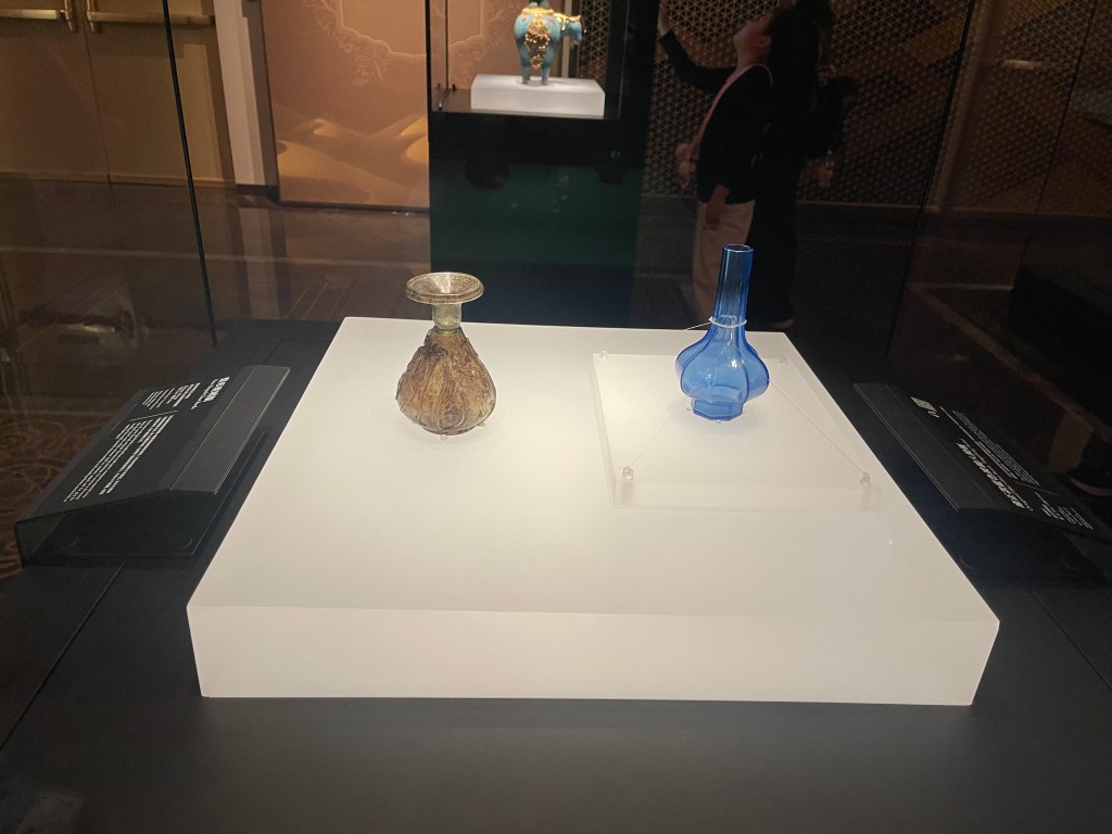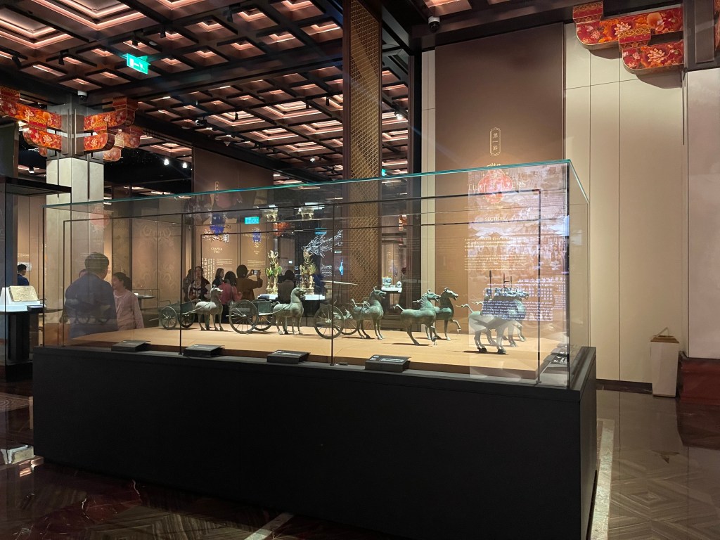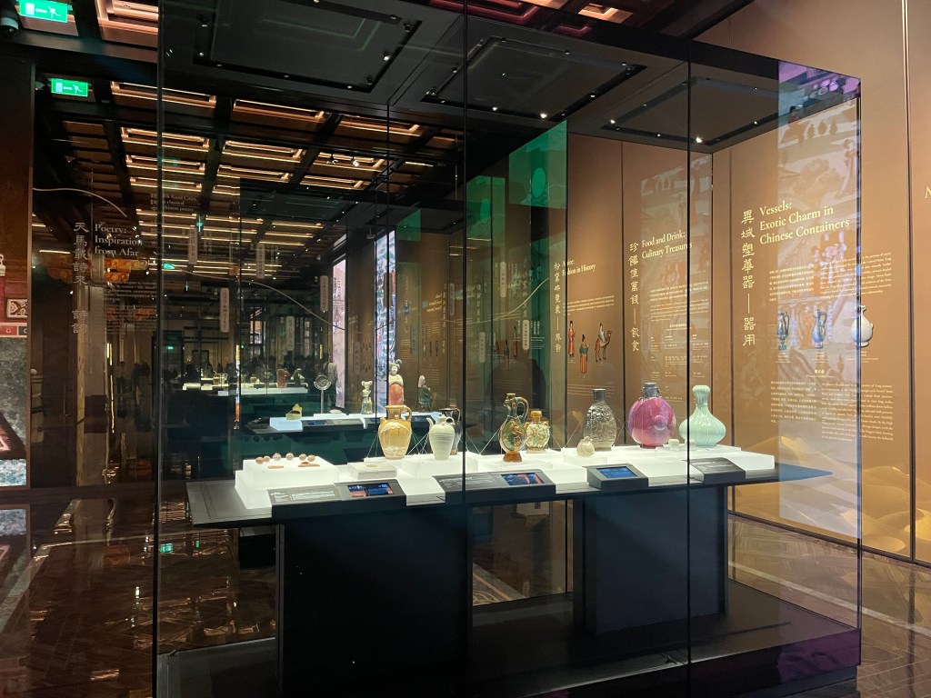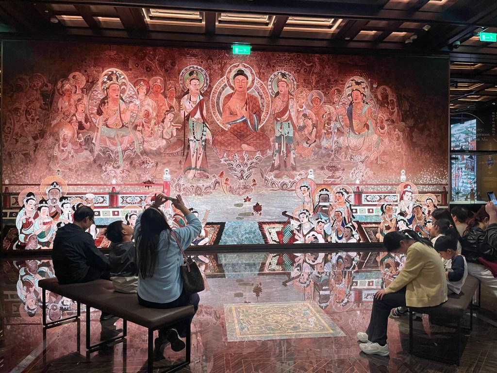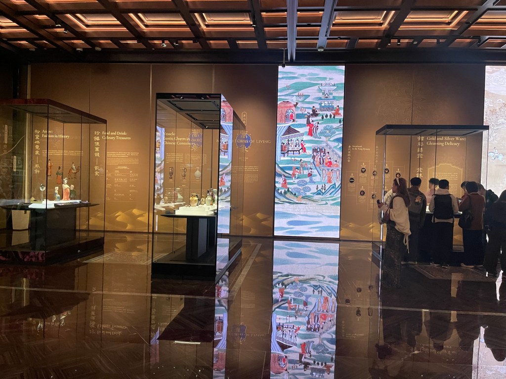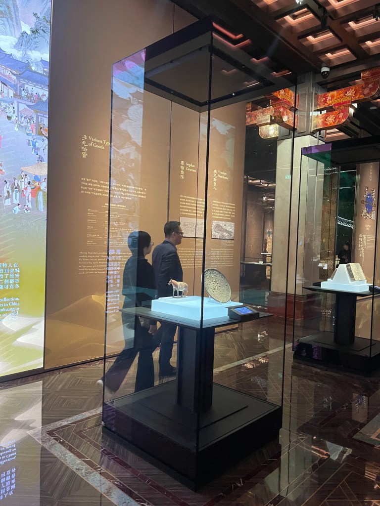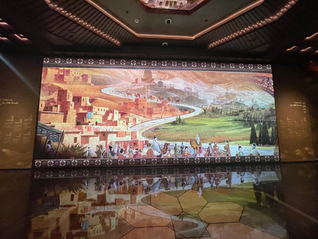 展覽以四大單元鋪陳脈絡︰「瀚海西風」、「星漢燦爛」、「和光同塵」、「大道錦程」。從開拓、到技術與生活、到精神與審美、再到古今互證的當代表達,形成一條從「鑿空」走向「未來」的敘事線。這種策展策略的關鍵,是不把絲路理解為某條固定路徑,而是把它視作一個長期運作的交流系統:貨物、工藝、宗教、法律制度、音樂與圖像語言,都在系統中流通、改寫與再生。在展廳裡看到不同時代、不同地域的作品彼此對話,像多語世界的同場翻譯,有時互相補全,有時互相挑戰,但幾乎總能讓觀眾意識到:文明的邊界從來不是牆,而是接縫。
