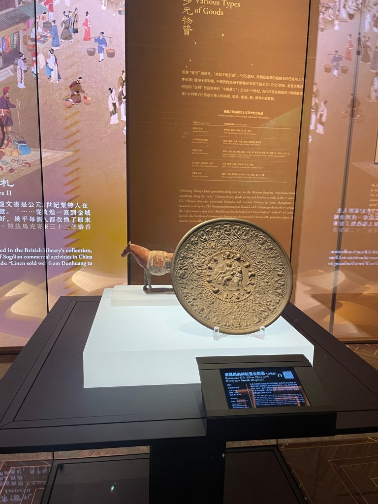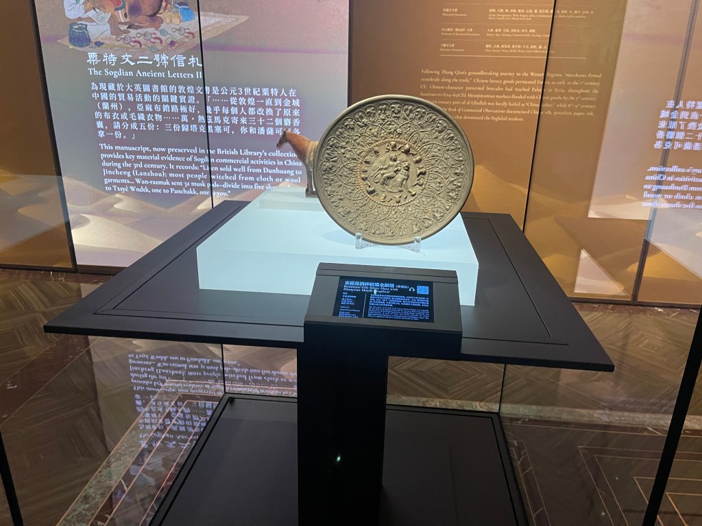 如果說貨幣與文書呈現絲路的「運行機制」,那麼器物工藝則呈現絲路的「轉譯能力」。例如東羅馬酒神紋鎏金銀盤(仿製品)以希臘神話題材與東羅馬風格出現在中國的考古語境裡,它最迷人的地方不在於「像不像西方」,而在於它如何成為跨文化審美的可攜帶版本:神話人物的姿態、十二神的頭像環列,作為一套圖像語法,在絲路的長距離流動中被保存、被誤讀、也被重新理解。這類作品往往讓人意識到,交流不一定以「完全理解」作為前提;很多時候,是先被喜愛、被收藏、被模仿,理解才慢慢追上。