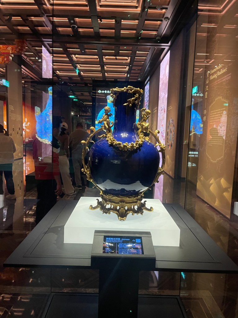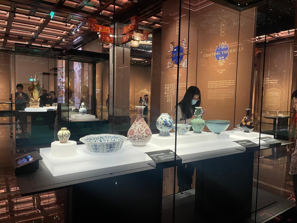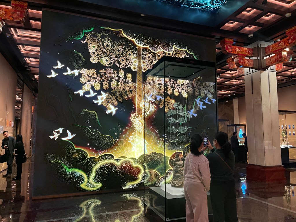 展覽的第二單元「星漢燦爛」所強調的,正是技術沿路徑傳播、最後顯現在衣食住行之中。綠地聖樹雙鹿紋緯錦就是「落地」的例子,以聯珠團窠與「陵陽公樣」的設計語言,展示波斯紋樣如何啟發唐代織物構圖;龍紋寶座毯把織毯工藝的長距離傳播史,濃縮在一張厚密、近乎浮雕效果的織造巔峰之作中;六角形梅森瓷連蓋茶葉罐則把敘事一下跳到18世紀歐洲,當「中國熱潮」與硬質瓷技術的突破相遇,中國瓷器不再只是輸出品,而是成為歐洲工業、審美與消費文化的一部分。這些作品把絲路從「古代」延長到「近代全球化」:道路換了形式,交換仍然持續。