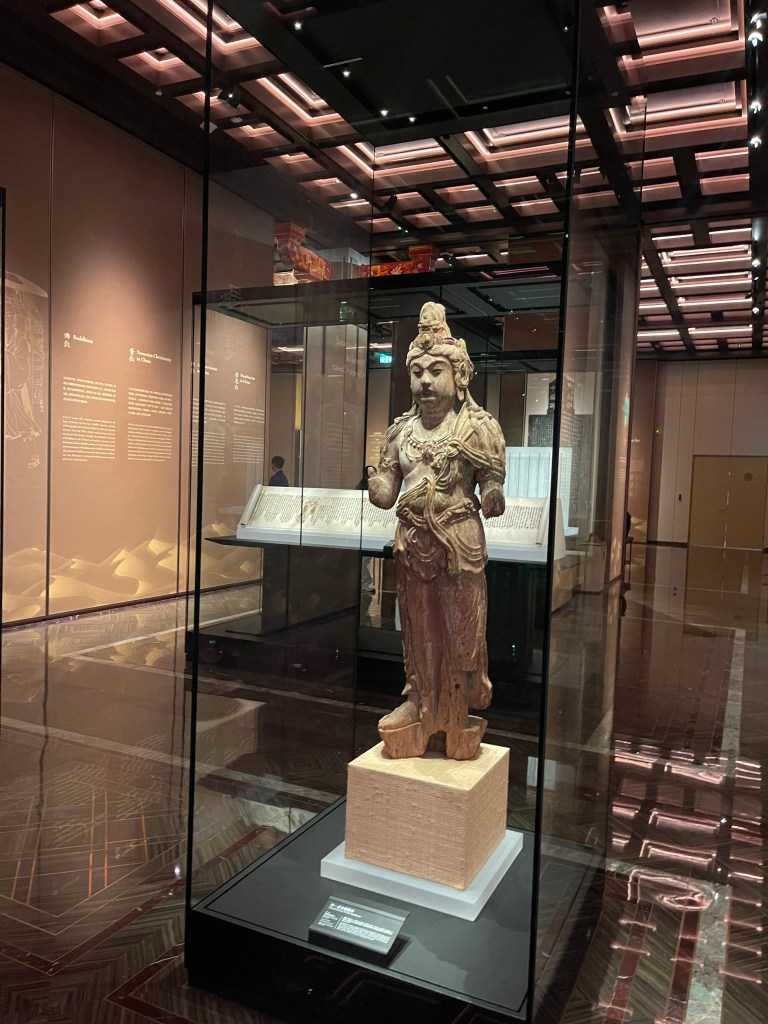第三單元「和光同塵」把焦點從物質轉向精神與審美,圖像、雕塑、音樂與典籍如何促成人類深層對話。佛陀立像(犍陀羅風格)是一個非常典型的例子:希臘式的人體重心、源於西亞造像傳統的手印意涵、伊朗文化象徵的背光,這些元素在同一尊佛像上共存,讓「宗教東傳」不再只是路線問題,而是形式語言的混血史。另一端,大秦景教流行中國碑拓片(仿製品)則提示另一種更難的轉譯:把一套外來信仰的教義,用中國思想語境重新組織成可被理解的文本。當宗教不是以征服方式進入,而是以「解釋」「對應」「互證」方式落地,它就會留下更耐久的文化痕跡。