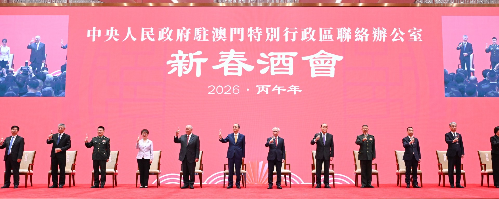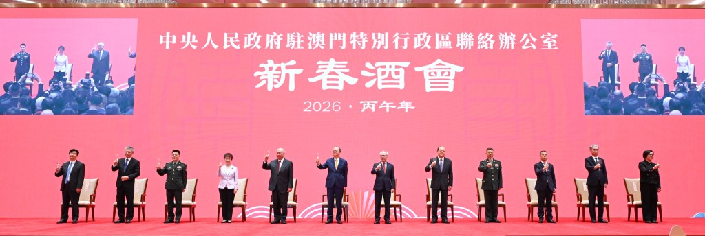 2月5日下午,中央政府駐澳門聯絡辦公室舉辦2026年新春酒會。受中央港澳辦主任、國務院港澳辦主任夏寶龍委託,中央港澳辦副主任、國務院港澳辦副主任,中央政府駐澳門聯絡辦公室主任鄭新聰代表夏寶龍主任、中央港澳辦、國務院港澳辦和中央政府駐澳門聯絡辦公室向廣大澳門居民致以新春祝福。澳門特別行政區行政長官岑浩輝出席並致辭,全國政協副主席何厚鏵,前行政長官賀一誠,外交部駐澳門特派員公署特派員卞立新,解放軍駐澳門部隊司令員於長江、政委林慶華,中央政府駐澳門聯絡辦公室副主任黃柳權、呂玉印、張應杰,以及特別行政區立法、司法機構主要負責人,特別行政區政府主要官員,澳區全國人大代表、全國政協委員,特別行政區行政會委員、立法會議員,以及澳門社會各界代表人士約1300人出席酒會。