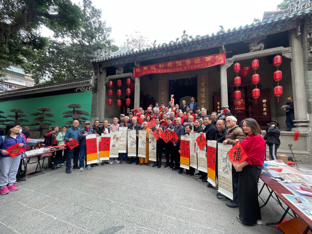 澳門書法院、南國紅豆藝苑及澳門普濟禪院聯合主辦「駿馬迎新歲揮春送百福」活動,八日下午二時半在普濟禪院前舉行,四十多位本地書畫界人士參加,替街坊書寫揮春及春聯,送百福賀馬年。