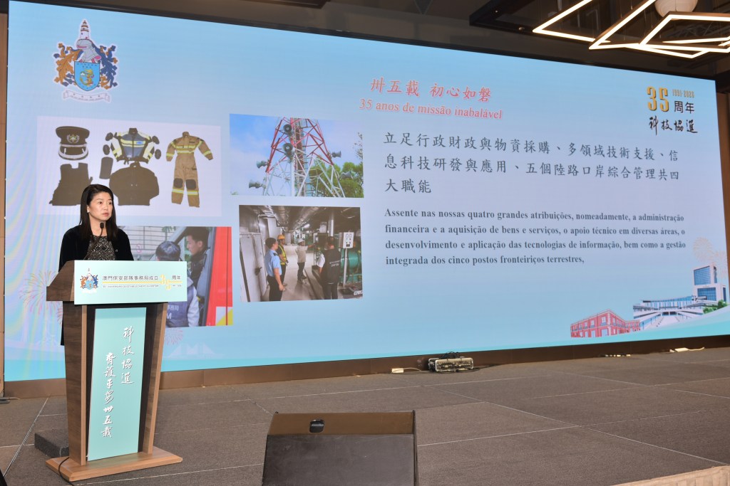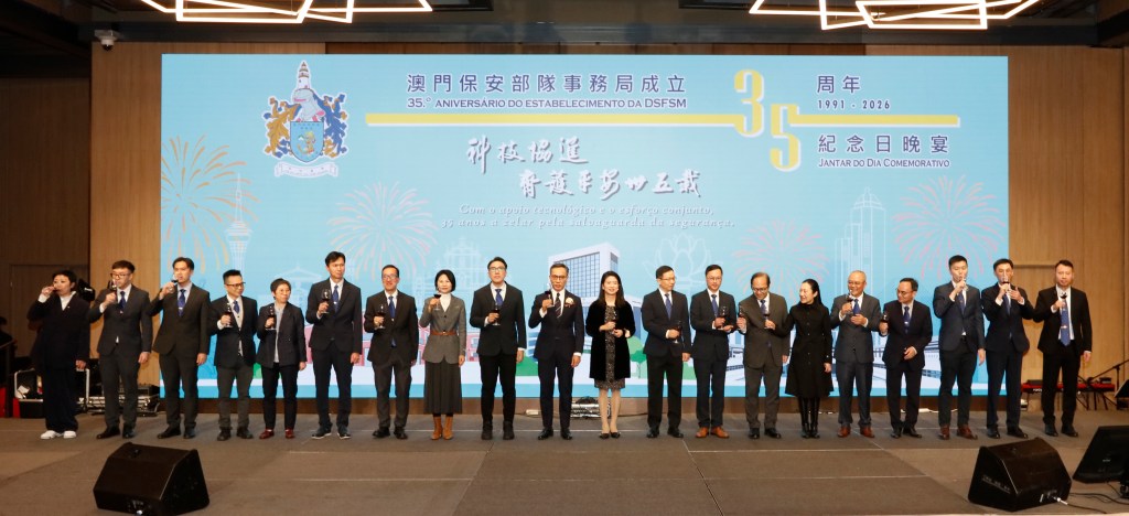 為慶祝澳門保安部隊事務局成立三十五周年,該局於2月4日假澳門旅遊塔四樓宴會廳舉行晚宴,以「科技協進齊護平安」為主題,回顧該局發展歷程,分享在資訊技術研發、綜合技術、口岸保障及行政管理等方面的工作成果,並展望未來工作。