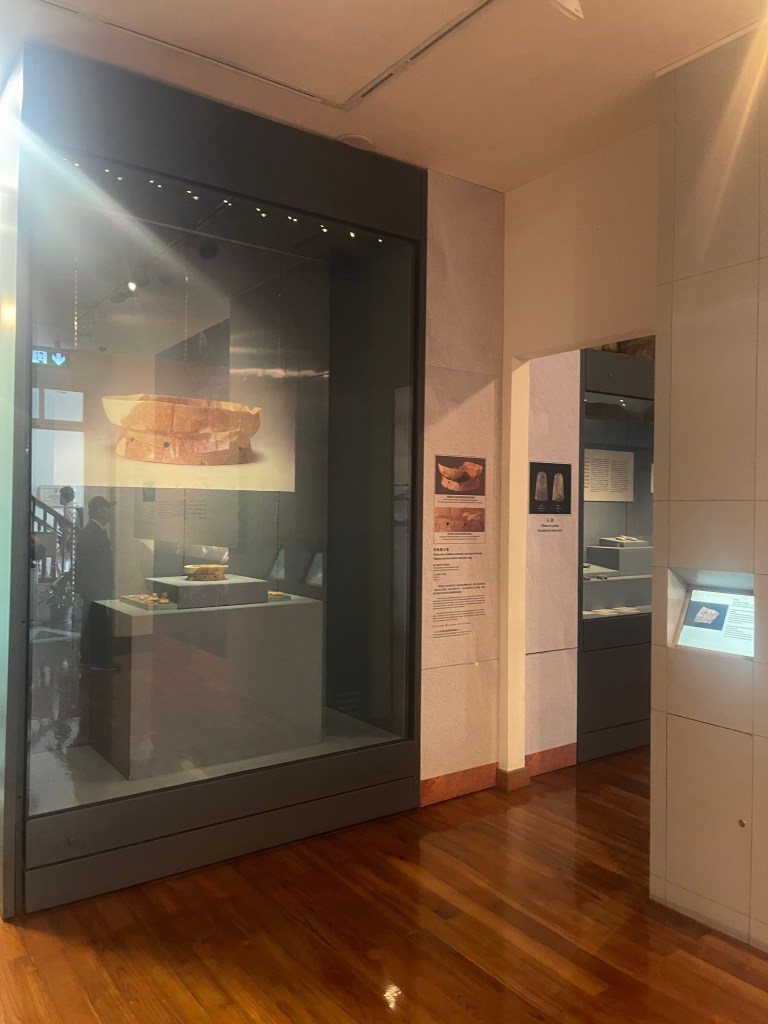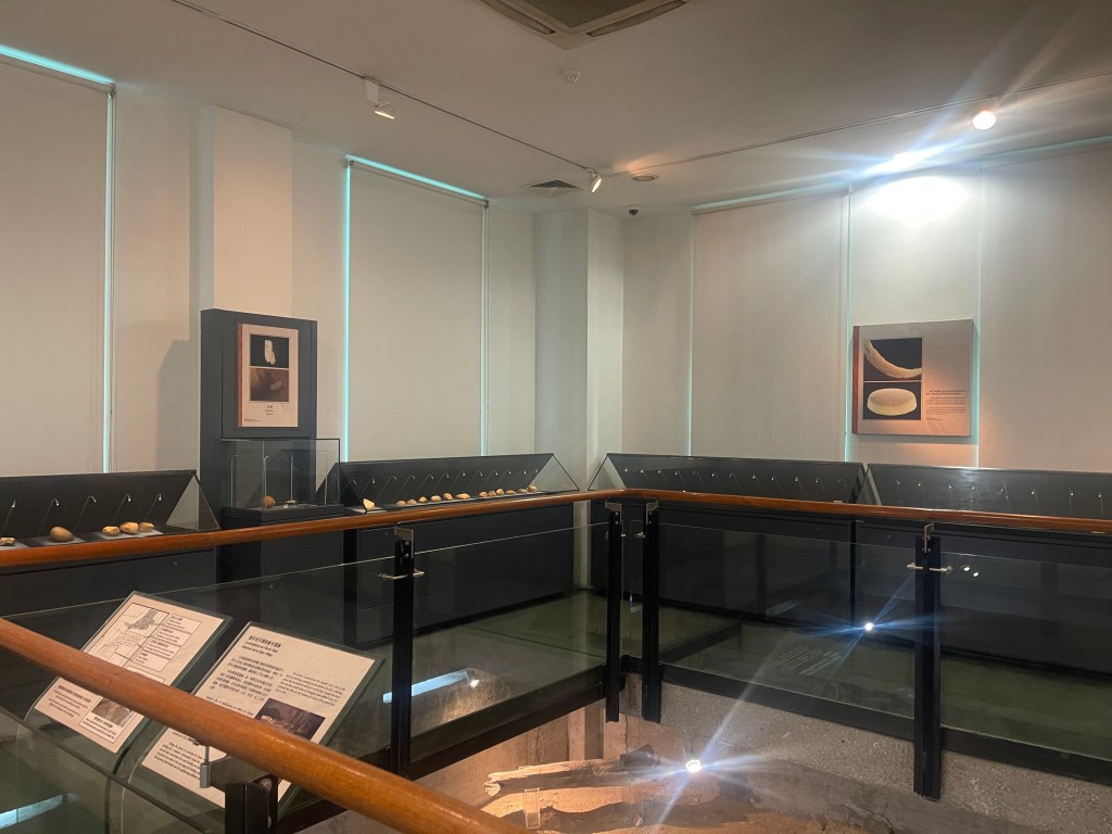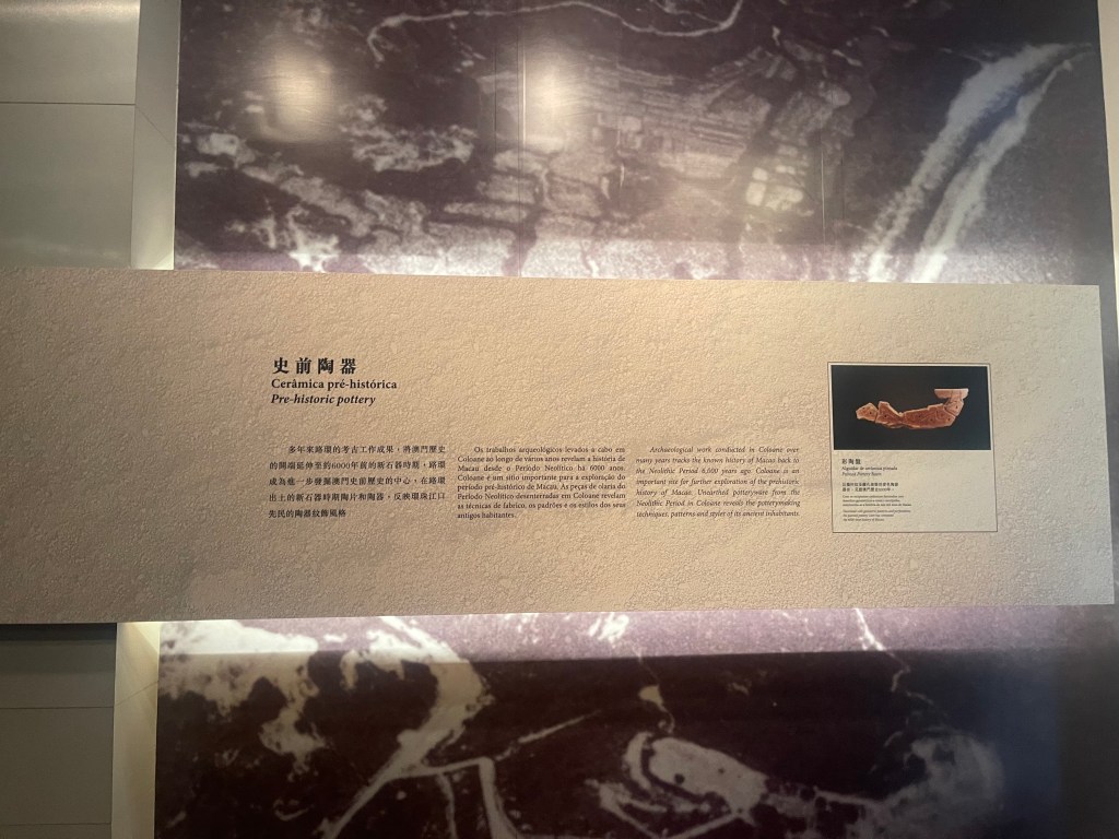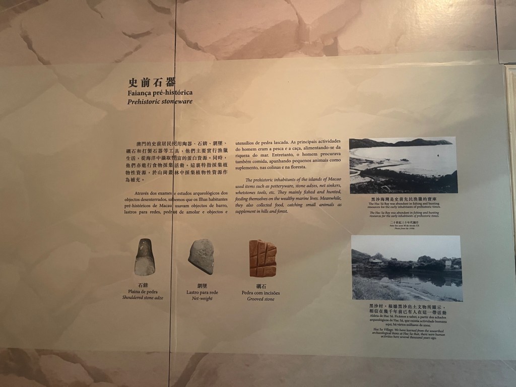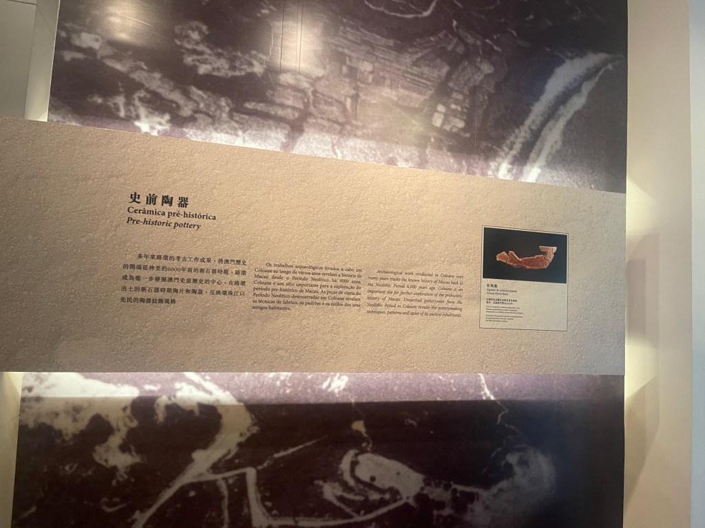 一樓首兩個展室以「路氹考古」為主題,系統展示1970年代至1980年代在路環黑沙進行多次發掘所出土的文物。新石器時代石器、網墜、尖狀器物、環玦飾物,以及漢代硬陶片、宋代青釉瓷片、明代青花瓷片、清代錢幣等,構成一條跨越數千年的時間序列。其中彩陶圈足盤及其殘片尤為引人注目,反映珠江口地區史前文化的工藝水準與審美意識。展區並配以土層圖柱與考古素描圖,加強公眾對發掘過程與地層關係的理解。