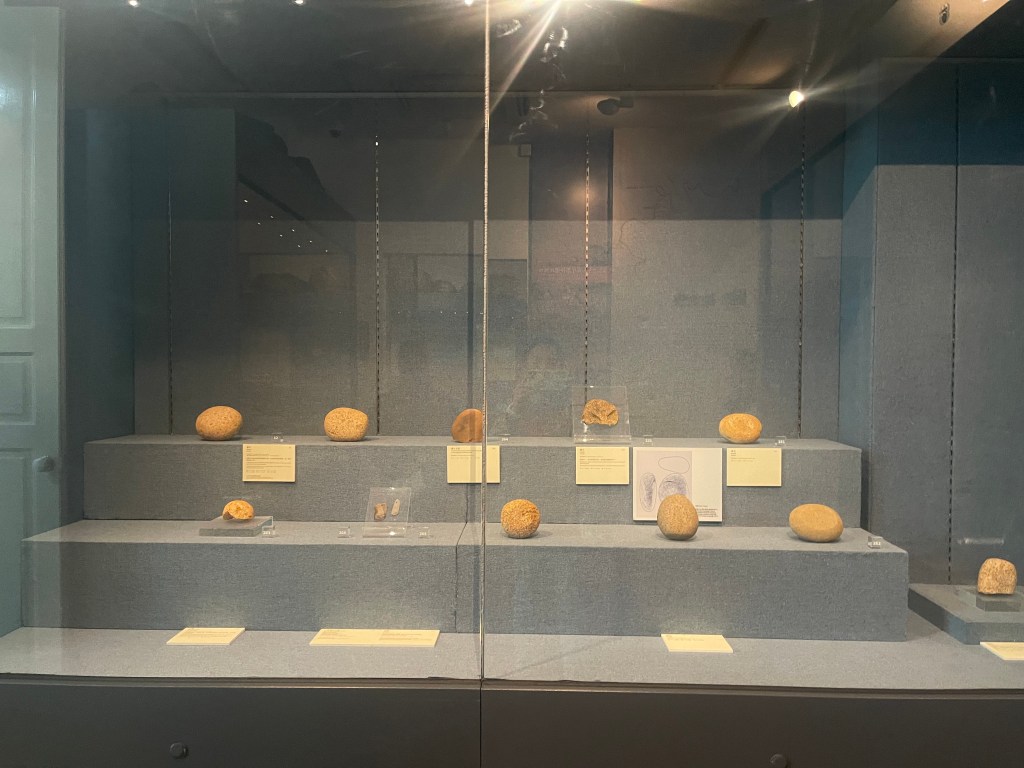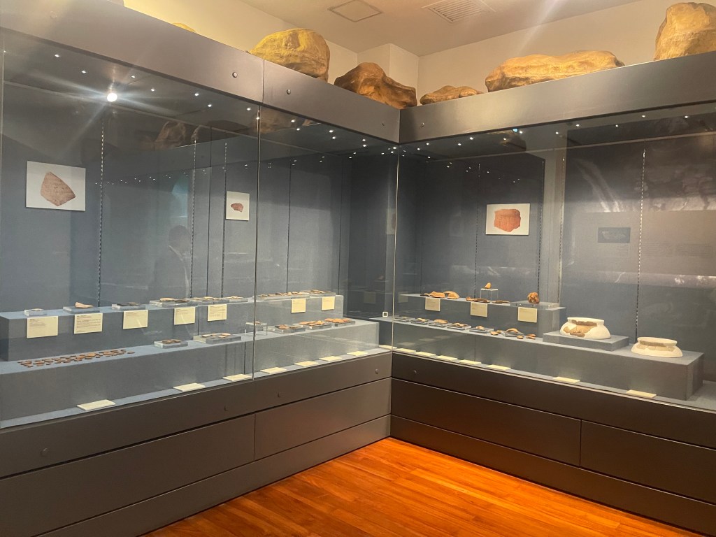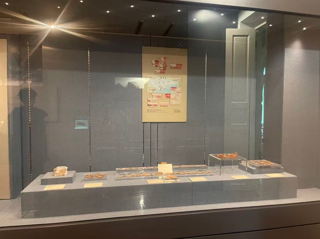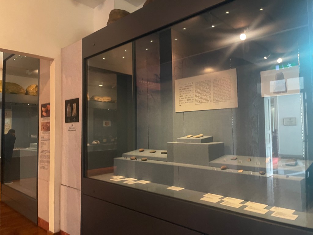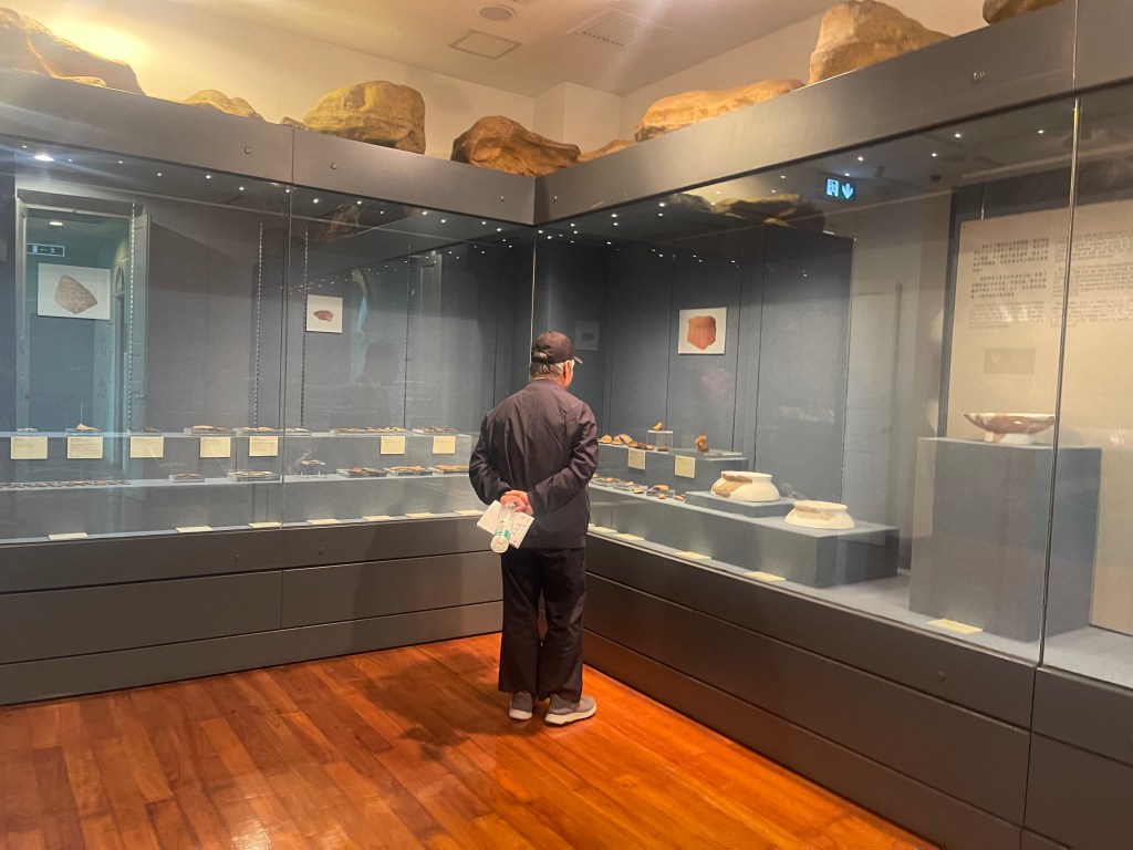 一樓首兩個展室以「路氹考古」為主題,系統展示1970年代至1980年代在路環黑沙進行多次發掘所出土的文物。新石器時代石器、網墜、尖狀器物、環玦飾物,以及漢代硬陶片、宋代青釉瓷片、明代青花瓷片、清代錢幣等,構成一條跨越數千年的時間序列。其中彩陶圈足盤及其殘片尤為引人注目,反映珠江口地區史前文化的工藝水準與審美意識。展區並配以土層圖柱與考古素描圖,加強公眾對發掘過程與地層關係的理解。