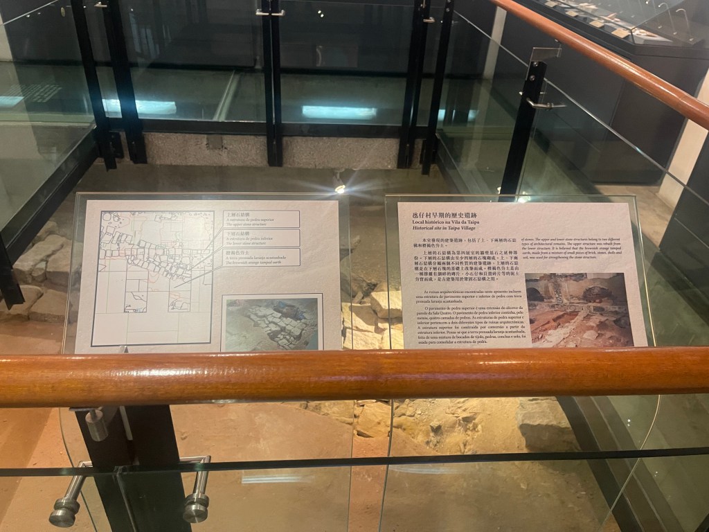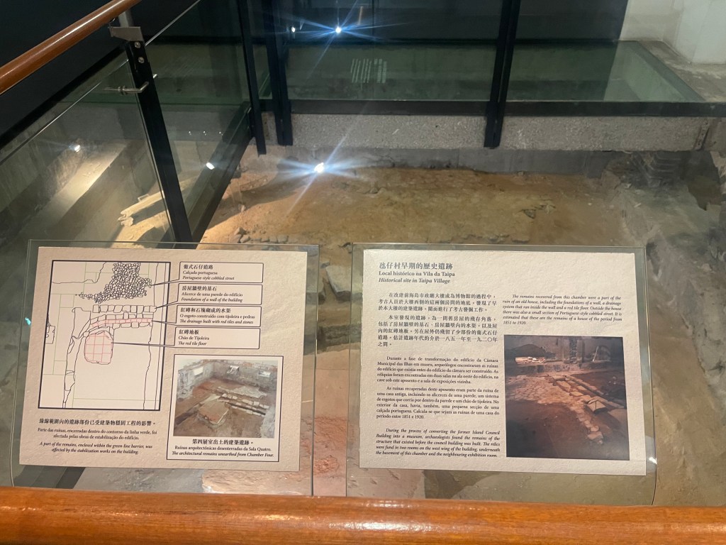 第一展室亦保留一處殘存房屋角落及葡式石仔道路遺蹟,年代介乎1851年至1920年間,早於現存建築。第二展室則集中展示「氹仔前海島市政廳地下室石結構遺址」出土文物,包括建築殘片與瓷片等,並透過多媒體方式介紹發掘背景與技術流程,使觀眾理解考古如何為地方史補充實證基礎。