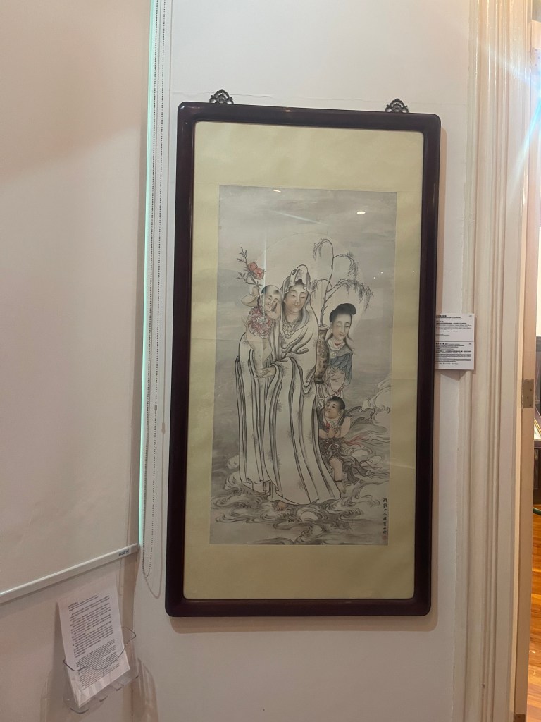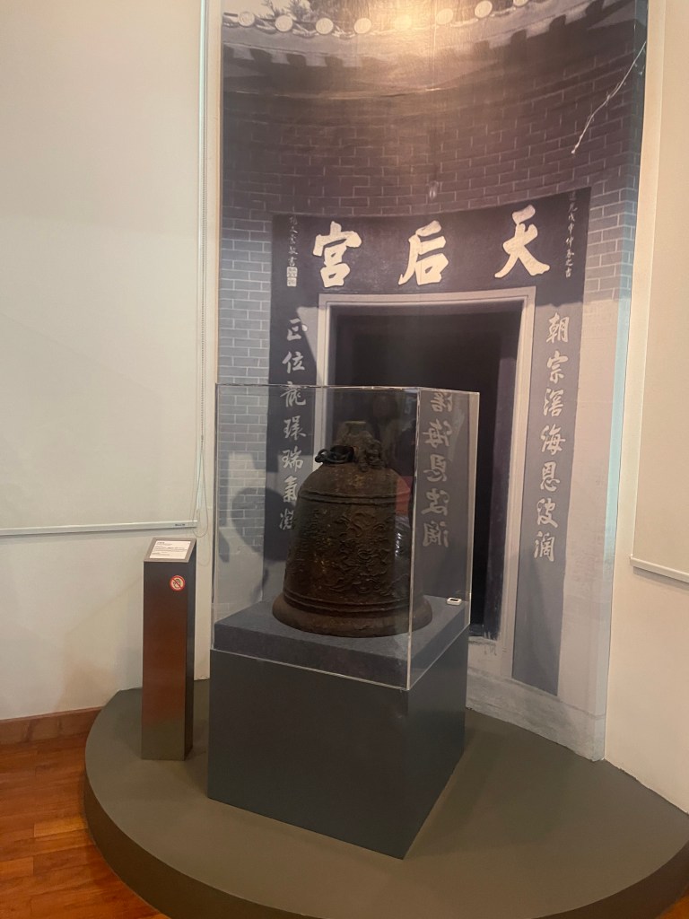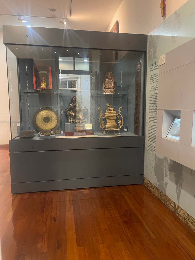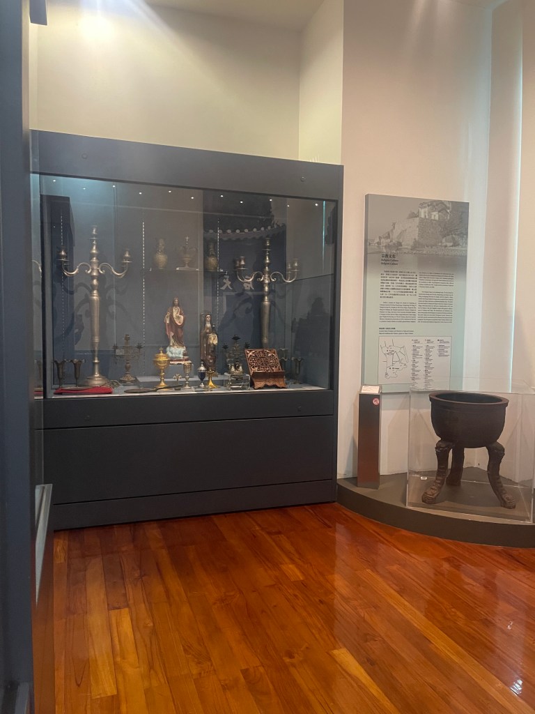 第四展室以「路氹宗教」為題,展出來自教堂與廟宇的宗教器物。基督聖像、聖爵、燭台與亞西西聖女像,與百年手抄道教經書、天后廟碑、譚公神像及雕版並列,反映中西信仰在路氹並存發展的歷史格局。宗教不僅是信仰實踐,也構成社群認同的重要部分。展室設有互動元素,使參觀者在理解之餘亦能參與體驗。