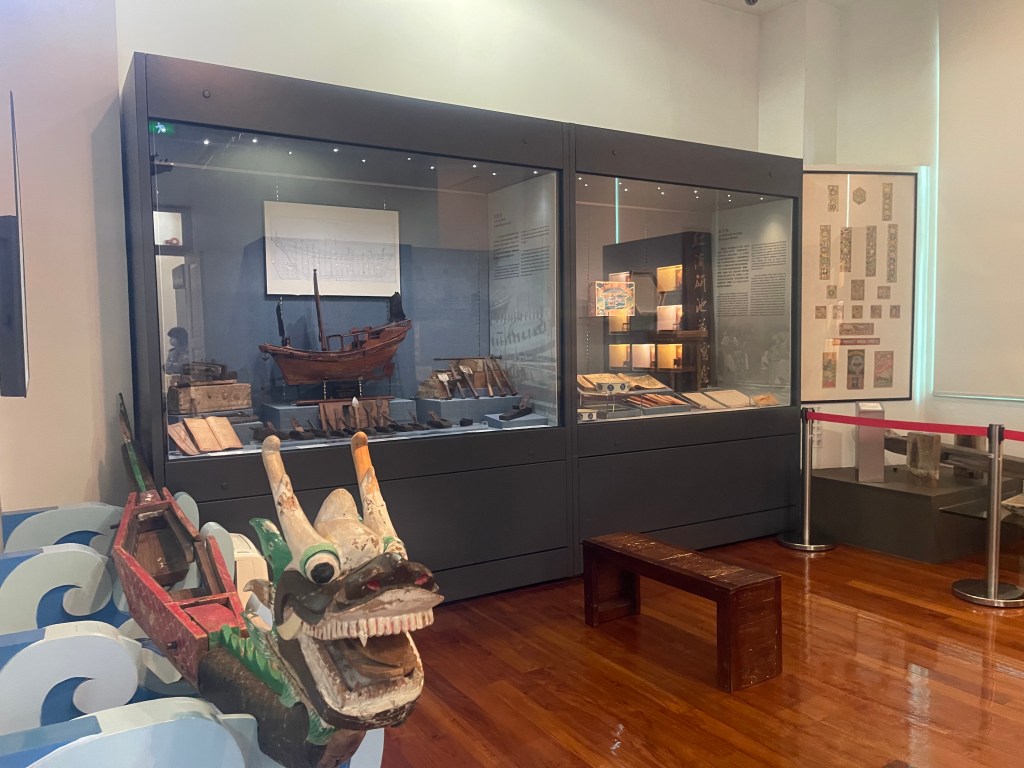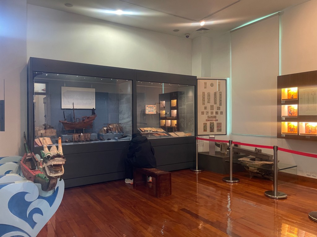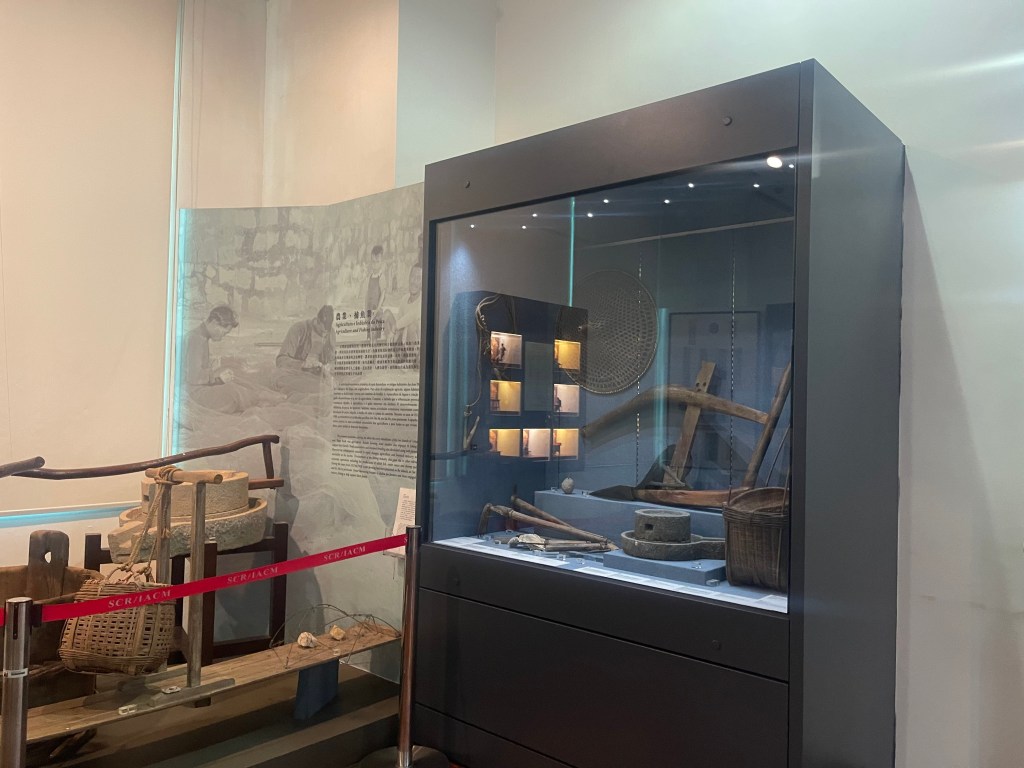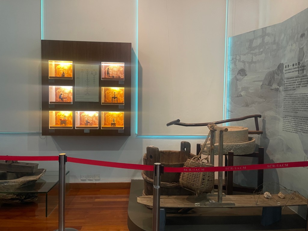 第七與第八展室聚焦經濟結構。農業、捕漁、採蠔、蝦醬與鹹魚製作等傳統產業,構成路氹早期經濟基礎。相關農具、石磨與鑿蠔工具,將生計活動具象呈現。第八展室則專題介紹炮竹業與造船業,透過爆竹模型與浮船骨模型展示手工技術與產業流程,顯示路氹曾在區域經濟網絡中扮演一定角色。