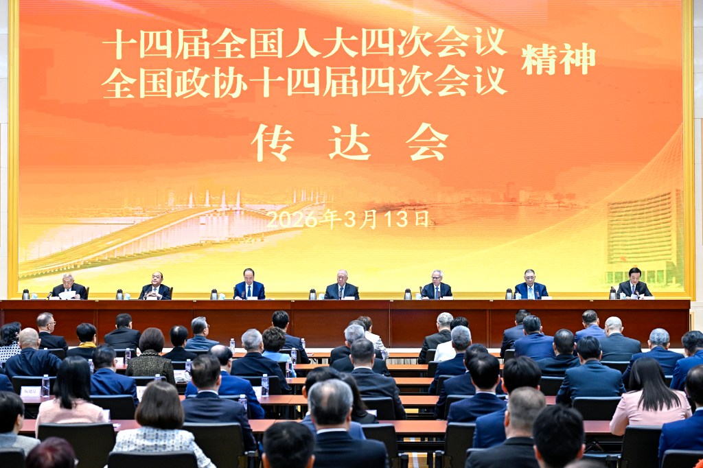 3月13日下午,中央政府駐澳門聯絡辦公室召開2026年全國兩會精神傳達會。全國政協副主席何厚鏵、澳門特別行政區行政長官岑浩輝、中央政府駐澳門聯絡辦公室主任鄭新聰分別講話,崔世安先生、賀一誠先生出席。澳門地區全國人大代表團團長劉藝良、全國政協常委崔世昌分別傳達十四屆全國人大四次會議、全國政協十四屆四次會議精神。外交部駐澳門特派員公署特派員卞立新,中央政府駐澳門聯絡辦公室副主任呂玉印、張應杰參加。