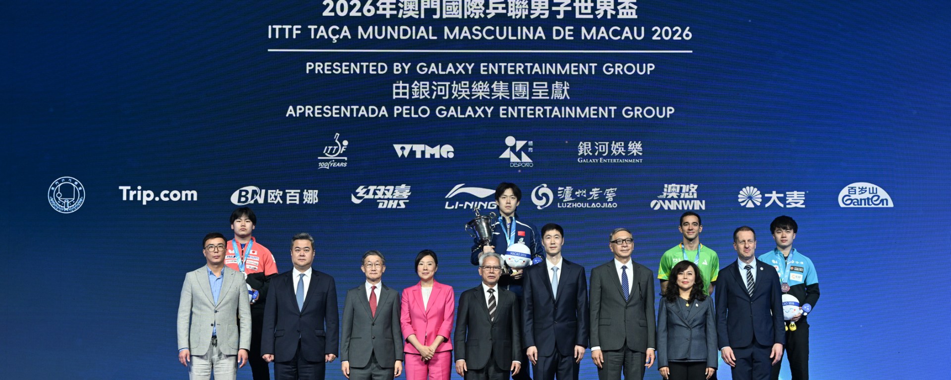 由國際乒乓球聯合會(ITTF)授權,體育局、銀河娛樂集團及世界乒乓球管理集團有限公司主辦、澳門乒乓總會協辦的「2026年澳門國際乒聯男子及女子世界盃 ─ 由銀河娛樂集團呈獻」,於4月5日在銀河綜藝館上演準決賽及冠軍戰,男、女子世界盃冠軍分別由中國王楚欽及孫穎莎奪得。