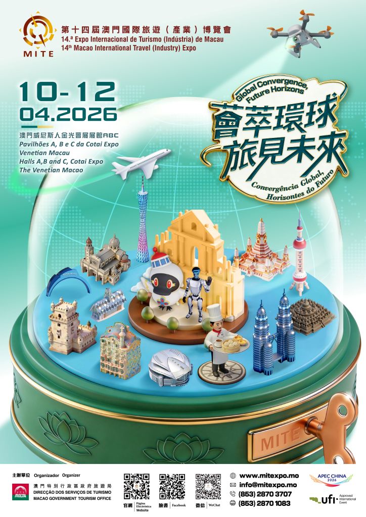 第十四屆澳門國際旅遊(產業)博覽會將於4日10至12日一連三天假澳門威尼斯人金光會展展館A、B及C舉行,公眾免費入場。旅博會在周五(4月10日)揭幕,本屆以「薈萃環球,旅見未來」為主題,匯聚全球旅遊資源與創新元素,着力促進更多「旅遊+」跨界合作商機。