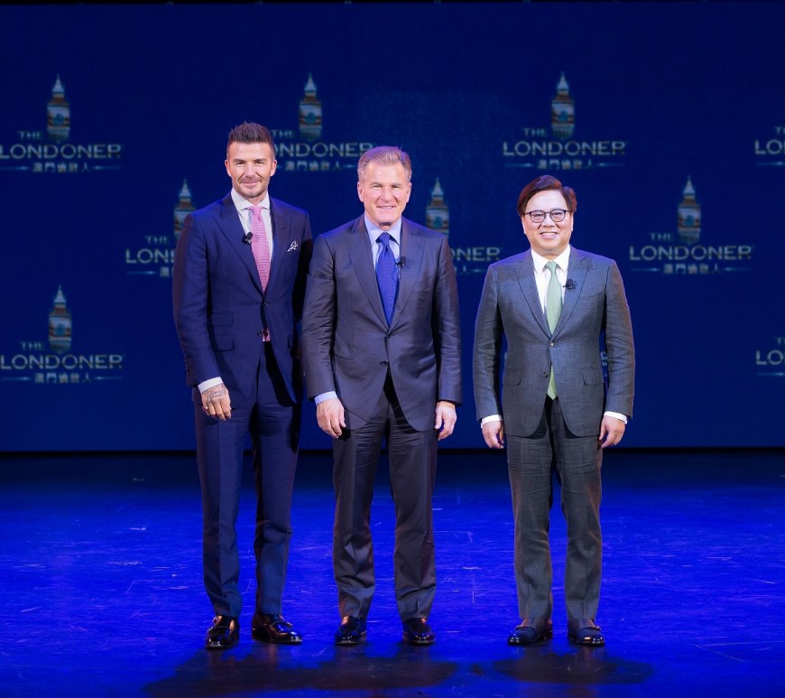 拉斯維加斯金沙集團與金沙中國有限公司管理層人員,聯同國際知名商人大衛.碧咸一同出席澳門倫敦人新聞發佈會,介紹將金沙城中心翻新、擴建及重塑為一處新的綜合度假村目的地之發展項目。