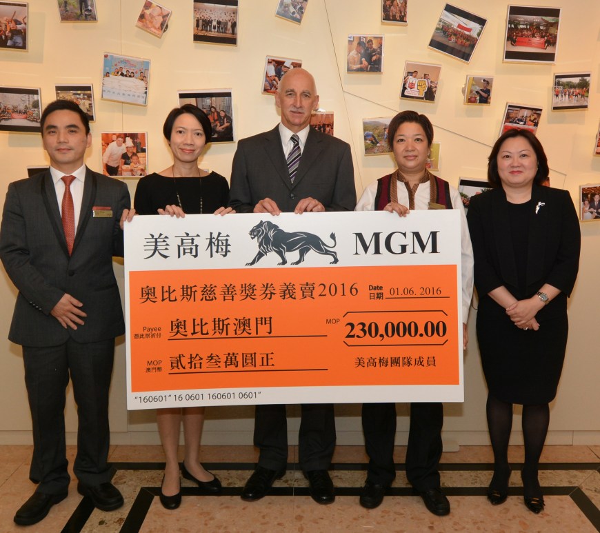 美高梅連續第八年參與由奧比斯澳門舉辦的「奧比斯慈善獎券義賣活動」,在金獅團隊的慷慨支持下,為奧比斯籌得合共澳門幣230,000元兒童救盲經費,再次成為捐款額最高之機構,為社會慈善業務出一分力。