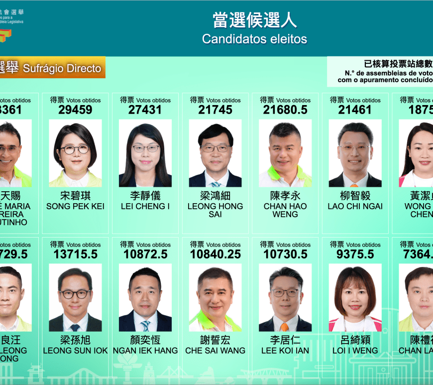 澳門特別行政區第八屆立法會選舉於9月14日圓滿舉行,投票工作有序完成。直選部分共有175,272名選民投票,投票率達53.35%;間選則有6,645名選民投票,投票率高達88.12%。行政長官岑浩輝代表特區政府,向初步當選的14名直選及12名間選議員致以祝賀,並感謝所有積極行使公民權利的市民。