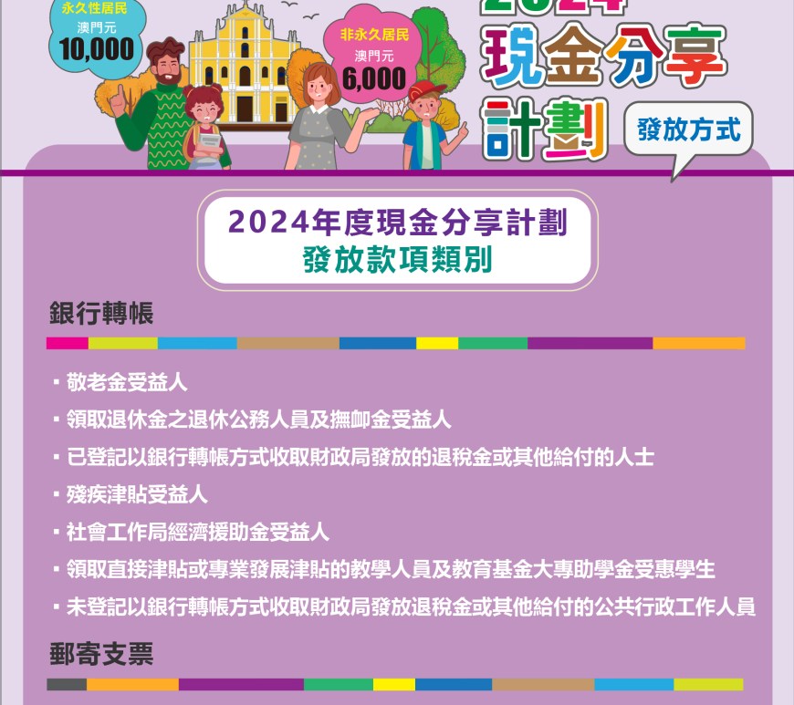《2024年度現金分享計劃》自7月2日起至7月31日透過銀行轉帳或郵寄劃線支票兩種方式,有序向717,018名合資格的澳門永久性居民每人發放1萬澳門元,以及向30,850名合資格的非永久性居民每人發放6千澳門元。