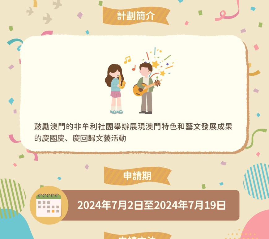 為慶祝中華人民共和國成立75周年、澳門回歸祖國25周年,文化發展基金推出「慶國慶75周年、回歸25周年文化活動資助計劃」,鼓勵澳門依法成立的非牟利社團舉辦展現澳門特色和藝文發展成果的慶國慶、賀回歸的文藝活動,提升全澳門的喜慶氛圍,進一步推動社會廣泛參與,同賀雙慶盛事。